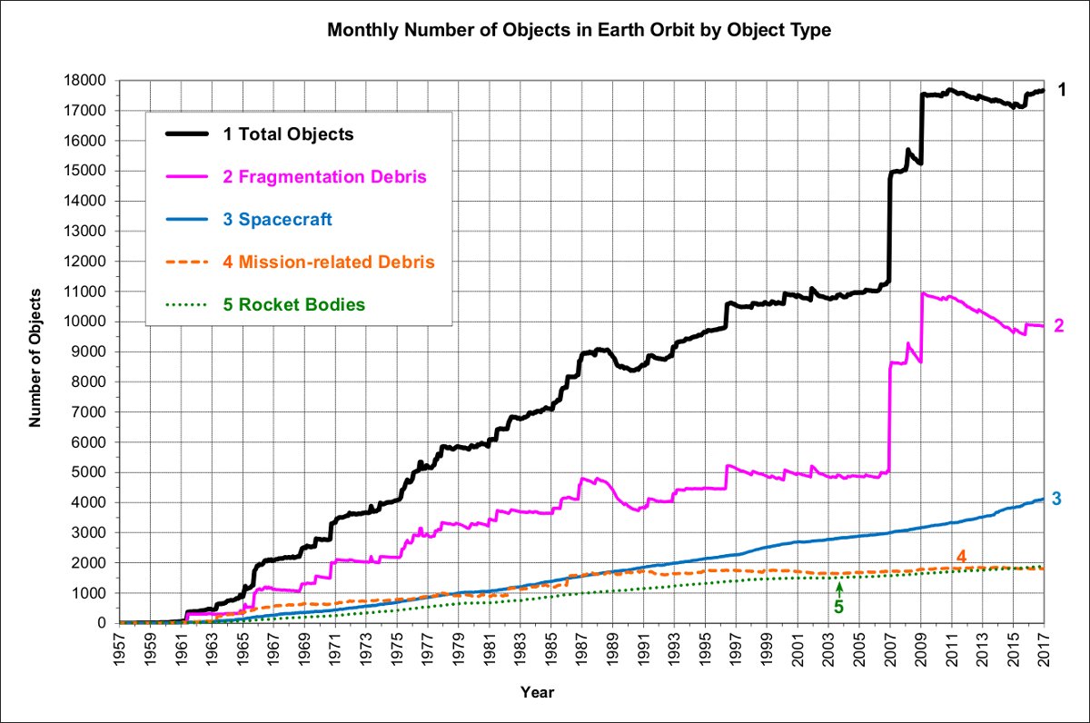 Warto tu jednak zauważyć, że głównie wskutek dwóch wydarzeń (2007: "zestrzelenie" chińskiego satelity, 2009: kolizja dwóch satelitów) ilość szczątków wzrosła z około 5 tysięcy pod koniec 2006 roku do wspomnianych prawie 18 tysięcy pod koniec 2010 roku. Wiele ze szczątków z tych dwóch wydarzeń wciąż krąży i przebywa na orbitach, z których "naturalna" deorbitacja trwać będzie przez kolejne dekady.