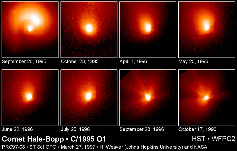 Obserwacje okolic jądra komety Hale-Bopp przez HST / Credits ? H. Weaver, NASAOprócz astronomów amatorów, C/1995 O1 Hale-Bopp była obserwowana także przez obserwatoria astronomiczne, w tym kosmiczny teleskop Hubble (HST). Obserwacje z HST wykonywano od 1995 roku, co pozwoliło m.in. na wyznaczenie okresu obrotu komety (około 11 godzin i 45 minut), szacunek wielkości (30-40 km, choć możliwe, że i więcej) oraz zmianę aktywności komety (m.in. różna ilość strumieni materii). Na tej komecie wykryto także związki organiczne oraz argon, którego nigdy wcześniej nie wykryto u komet.