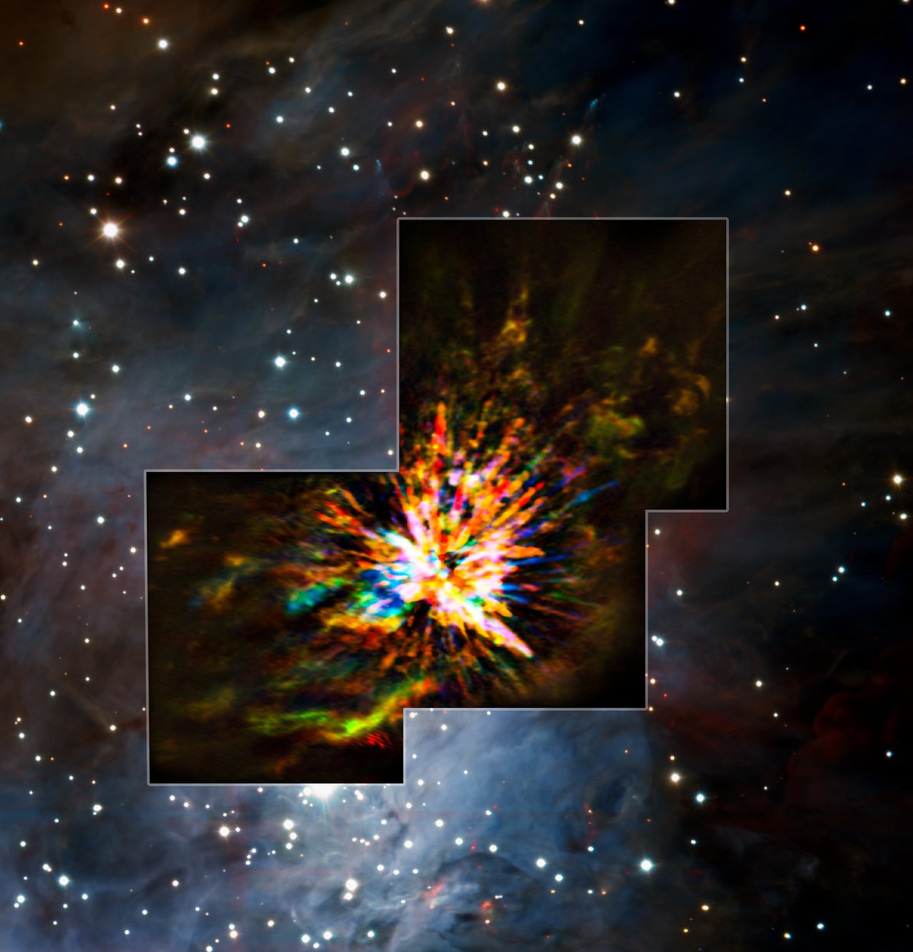 Gwiezdne wybuchy są najczęściej związane z supernowymi ? spektakularnymi śmierciami gwiazd. Ale nowe obserwacje ALMA dostarczyły wglądu w eksplozje na drugim końcu gwiezdnego cyklu życia, przy narodzinach gwiazd. Astronomowie uzyskali te dramatyczne obrazy gdy badali podobne do fajerwerków pozostałości z narodzin grupy masywnych gwiazd. Pokazuje to, że powstawanie gwiazd także może być gwałtownym i wybuchowym procesem.1350 lat świetlnych od nas, w kierunku gwiazdozbioru Oriona,, znajduje się gęsta i aktywna fabryka gwiazdotwórcza o nazwie Obłok Molekularny Oriona 1 (Oriona Molecular Cloud 1, w skrócie OMC-1), część tego samego kompleksu, co słynna Mgławica Oriona. Gwiazdy rodzą się, gdy obłok gazu, setki razy masywniejszy niż nasze Słońce, zaczyna kolapsować pod wpływem własnej grawitacji. W gęstszych rejonach zapalają się protogwiazdy i zaczynają w w sposób losowy dryfować. Z czasem niektóre z gwiazd zaczynają przemieszczać się w kierunku wspólnego centrum grawitacyjnego, który zwykle jest zdominowany przez szczególnie wielką protogwiazdę ? a jeśli gwiazdy będą miały bliskie spotkanie zanim uciekną ze swojego gwiezdnego matecznika, mogą zachodzić gwałtowne oddziaływania.