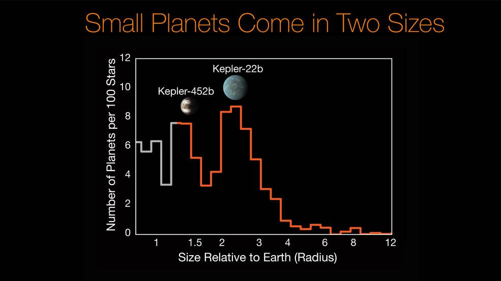Populacja małych egzoplanet na podstawie danych z teleskopów Kepler i Keck / Credits - NASAPołączenie danych z misji Kepler i z (naziemnego) teleskopu Keck sugerują, że istnieje pewna dysproporcja w ilości małych egzoplanet. Okazuje się, że jest stosunkowo dużo egzoplanet o średnicy zbliżonej do Ziemi oraz do średnicy około 1,5x większej od naszej planety ("super-Ziemie"). Następnie jest pewna "przerwa", po czym w zakresie 2 a 3 średnicy Ziemi występuje zwiększona ilość egzoplanet. Te obiekty noszą nazwę "mini-Neptun".