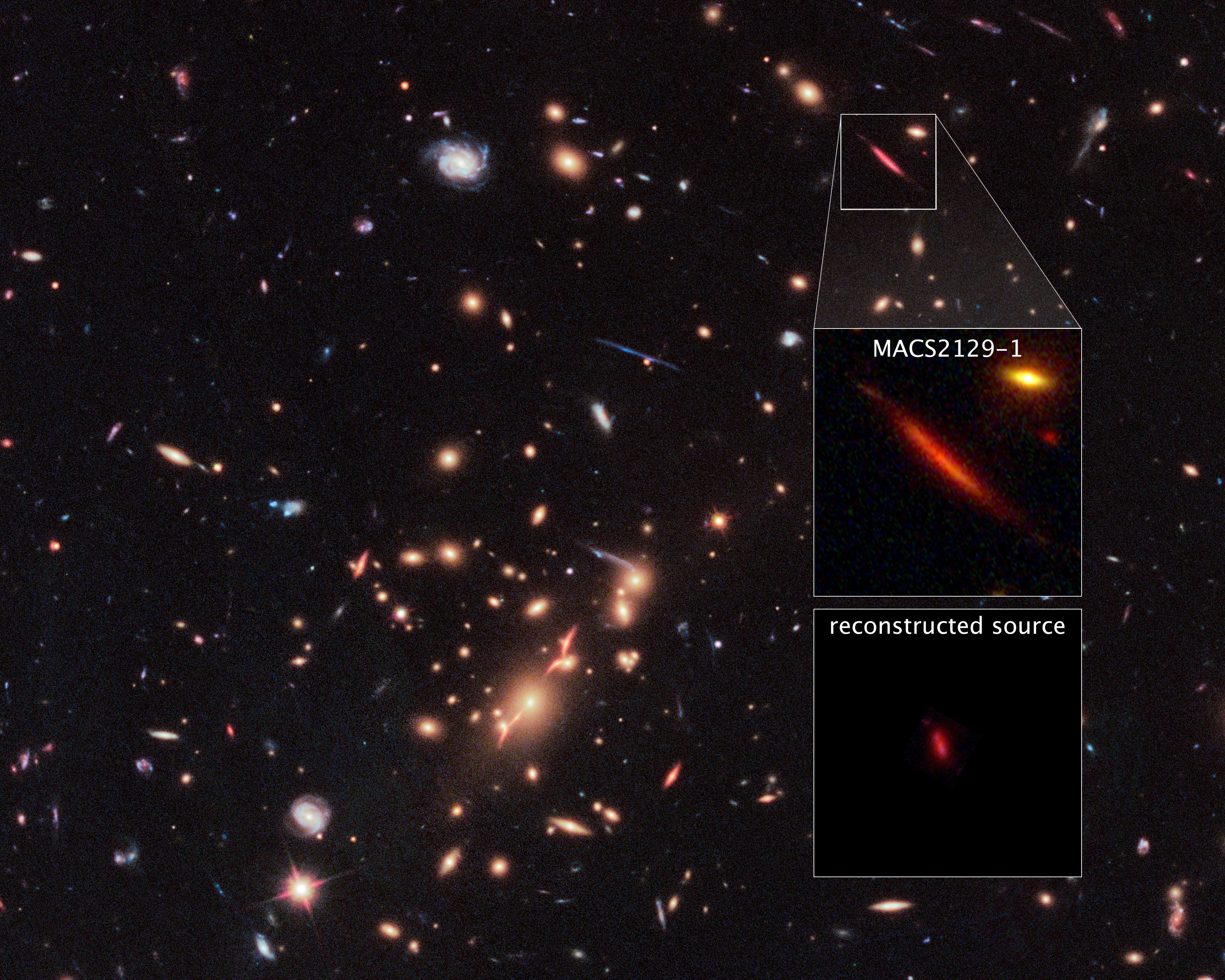 Acting as a 'natural telescope' in space, the gravity of the extremely massive foreground galaxy cluster MACS J2129-0741 magnifies, brightens, and distorts the far-distant background galaxy MACS2129-1, shown in the top box. The middle box is a blown-up view of the gravitationally lensed galaxy. In the bottom box is a reconstructed image, based on modeling that shows what the galaxy would look like if the galaxy cluster were not present. The galaxy appears red because it is so distant that its light is shifted into the red part of the spectrum.