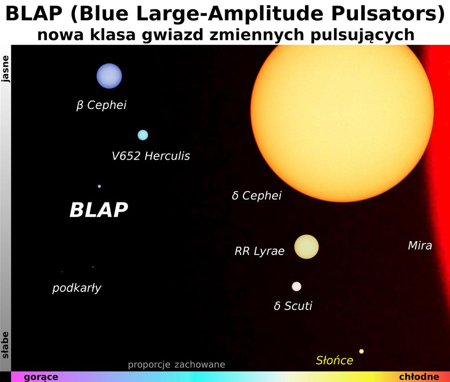 Porównanie rozmiarów gwiazd pulsujących różnych typów. Autor: Paweł Pietrukowicz / Obserwatorium Astronomiczne UWDzięki regularnym pomiarom jasności ponad miliarda gwiazd naszej Galaktyki astronomowie z prowadzonego w Obserwatorium Astronomicznym Uniwersytetu Warszawskiego projektu The Optical Gravitational Lensing Experiment (OGLE) odkryli nieznaną klasę gwiazd zmiennych pulsujących. Dodatkowe obserwacje pokazały, że są to obiekty znacznie gorętsze od Słońca. Niezwykłą cechą nowoodkrytych gwiazd jest ogromna zmiana ich parametrów fizycznych zachodząca w ciągu zaledwie około pół godziny. Tak szybkich zmian nie obserwowano dotąd w przypadku żadnych innych obiektów pulsujących. Modele teoretyczne potwierdzają, że takie zachowanie jest możliwe, ale wielką zagadką pozostaje pochodzenie takich gwiazd. Odkrycie nowej klasy gwiazd pulsujących astronomowie ogłosili w prestiżowym czasopiśmie