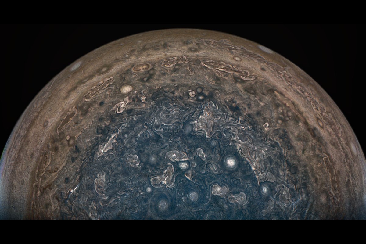 Południowy obszar polarny Jowisza (przetworzony obraz z danych z Juno) / Credits - NASA/JPL-Caltech/SwRI/MSSS/Roman TkachenkoWystrzelona w 2011 roku sonda Juno, która od roku znajduje się na orbicie Jowisza, wykonała w dniu 11 lipca bliski przelot w pobliżu planety, mijając jej najbardziej charakterystyczny twór - Wielką Czerwoną Plamę.