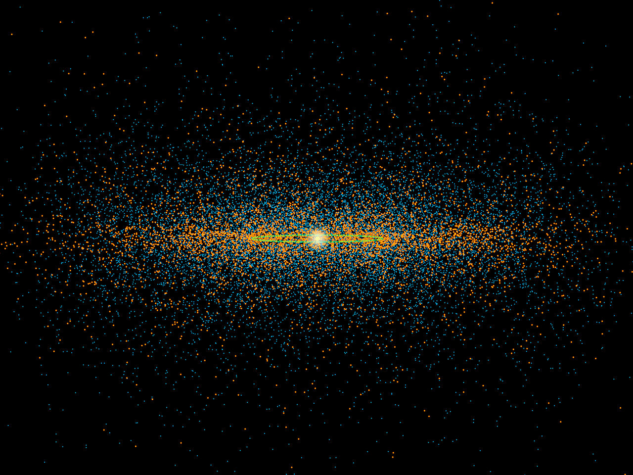 Symulowany rozkład przestrzenny planetoid bliskich Ziemi, w tym potencjalnie niebezpiecznych (pomarańczowe). Zielona linia wskazuje orbitę Ziemi. Źródło: