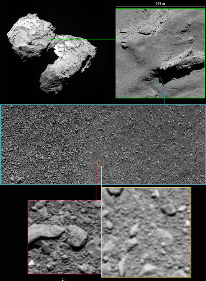 Zrekonstruowane ostatnie ?pół zdjęcia? z sondy Rosetta / Credits ? ESA/Rosetta/MPS for OSIRIS Team MPS/UPD/LAM/IAA/SSO/INTA/UPM/DASP/IDAZrekonstruowane zdjęcie zostało wykonane na wysokości około 19,5 metra nad powierzchnią komety 67P. Zdjęcie obejmuje obszar o długości około 1 metra. Rozdzielczość tego zdjęcia to około 2 mm na piksel. W tej rozdzielczości obszar lądowania sondy Rosetta nie ma gładkiej powierzchni ? widoczne są różne małe nierówności oraz większe bryłki materii. Co ciekawe, także kolor powierzchni nie wydaje się być jednorodny ? niektóre drobne fragmenty podłoża zdają się być nieco ciemniejsze od pozostałej części tego regionu.