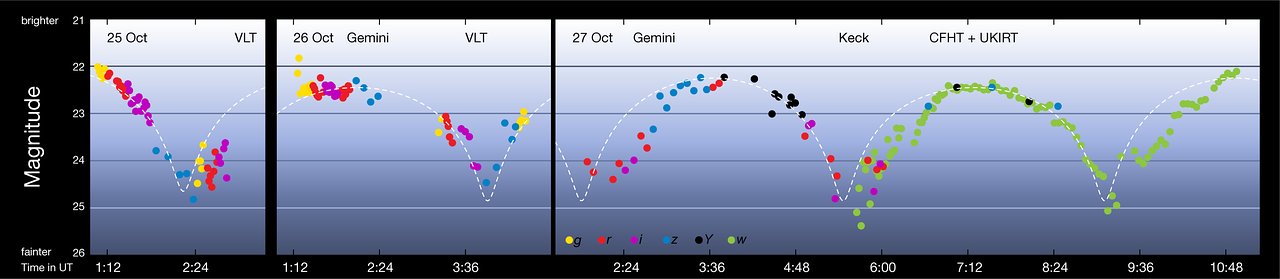 Po połączeniu zdjęć z instrumentu FORS na VLT, uzyskanych w czterech różnych filtrach, z obrazami z innych teleskopów, zespół astronomów, którym kierowała Karen Meech (Institute for Astronomy, Hawai`i, USA) odkrył, iż jasność `Oumuamua dramatycznie się zmienia o czynnik dziesięć, gdy obiekt obraca się wokół swojej osi co 7,3 godziny.