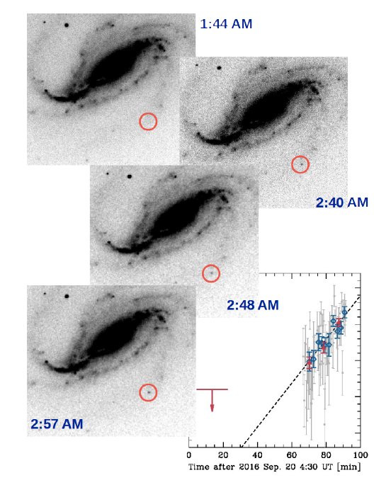 Zmiana jasności SN 2016gkg / Credits - Victor Buso (zdjęcia), Melina Bersten (wykres)Dalsza analiza danych oraz porównanie z modelami teoretycznymi wykazała, że gwiazda z której powstała, SN 2016gkg, przed “zapłonem” miała masę około pięciu mas naszego Słońca. Wcześniej ta gwiazda miała masę nawet dwadzieścia razy większą od naszego Słońca, jednak duża część materii została utracona, być może w formie transferu gazu (głównie wodoru) do towarzyszącej gwiazdy.