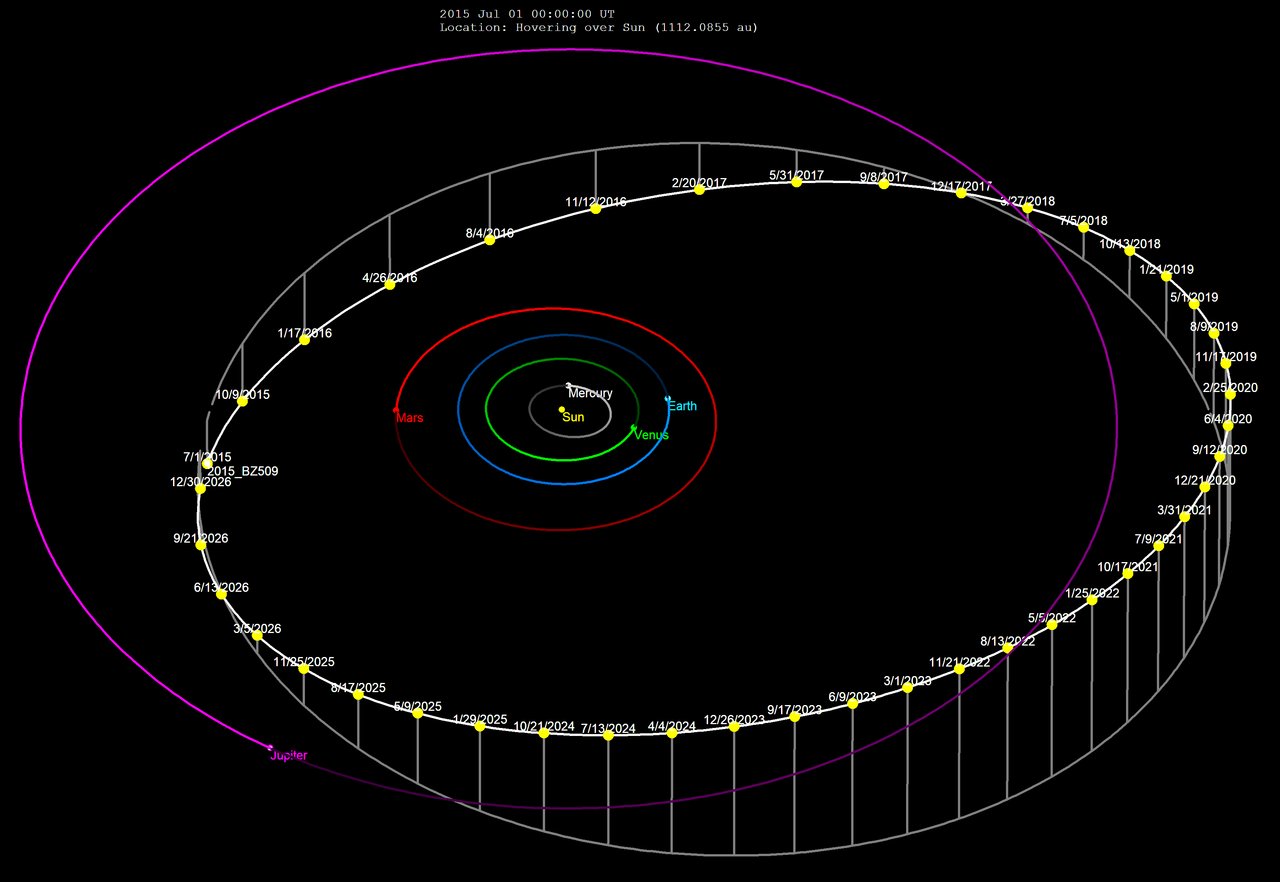 Astronomowie z francuskiego Universite de la Cote d’Azur i brazylijskiego Universidade Estadual Paulista postanowili bliżej przyjrzeć się planetoidzie 2015 BZ509. Ten obiekt, wykryty w listopadzie 2014 roku, ma bardzo nietypową orbitę: wsteczną, czyli o ruchu przeciwnym niż większość innych obiektów Układu Słonecznego. Co więcej, orbita ma duży związek z Jowiszem – w ciągu jednego jowiszowego roku gazowy olbrzym wykonuje ruch 360 stopni dookoła Słońca, zaś 2015 BZ509 wykonuje 366,3 stopnia, ale w przeciwnym kierunku. Minimalne zbliżenie pomiędzy 2015 BZ509 a Jowiszem wynosi około 175 milionów kilometrów.