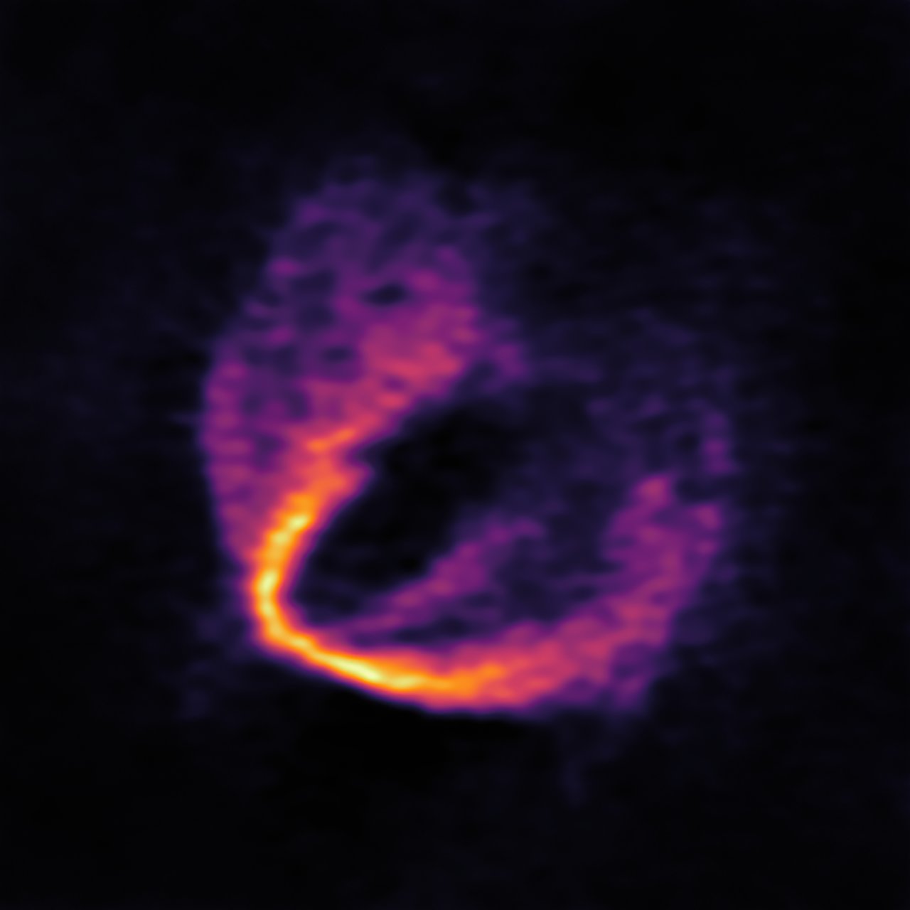 This image shows part of the ALMA data set at one wavelength and reveals a clear “kink” in the material, which indicates unambiguously the presence of one of the planets.