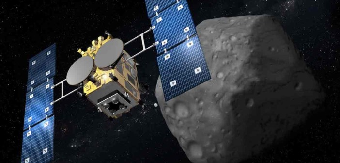 Hayabusa2 przy planetoidzie - wizja artystyczna / Credit: JAXA27 czerwca japońska sonda kosmiczna Hayabusa 2 dotarła do celu misji – planetoidy 162173 Ryugu.