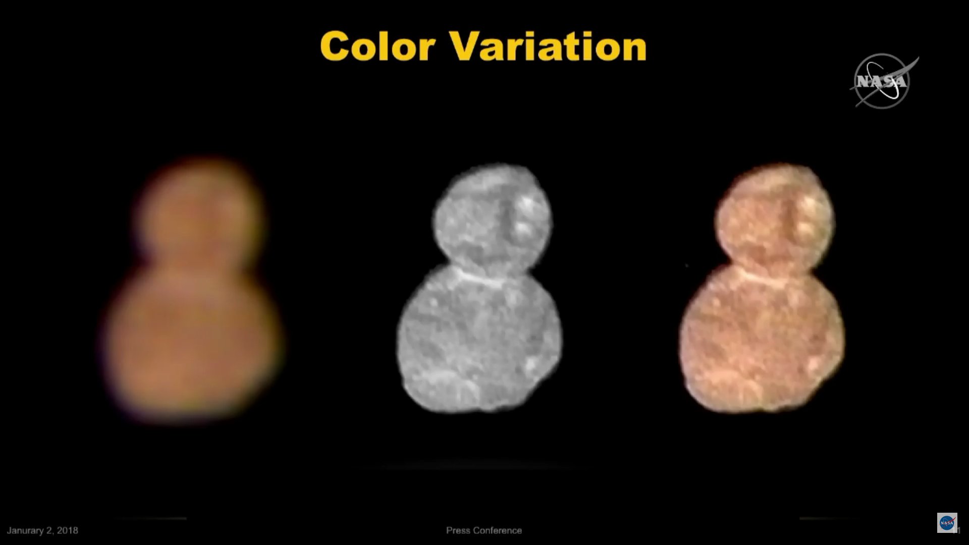 Kolorystyka powierzchni 2014 MU69 / Credits – NASA TVPierwsze konferencje opierały się o niewielki ułamek wszystkich danych zgromadzonych przez sondę. Komunikacja z sondą jest utrudniona – częściowo z uwagi na odległość, a częściowo z uwagi na naszą Dzienną Gwiazdę. Z perspektywy Ziemi, pomiędzy 4 a 10 stycznia NH przebywała zbyt blisko Słońca. W konsekwencji słaby sygnał transmitowany z sondy był zagłuszany lub nawet blokowany przez Słońce.