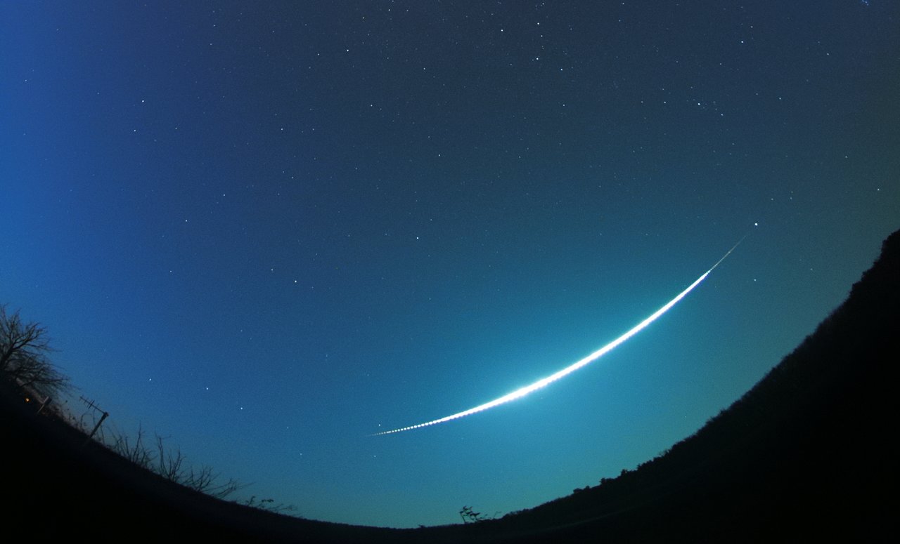 Fireball o sile -15 o nazwie Zdar nad Sazavou, który przeszedł nad Republiką Czeską 9 grudnia 2014 r. Sekcja obrazu całego nieba zrobiona przez Digital Autonomous Fireball Observatory na stacji Kucharovice. Kula ognia przeleciała od prawej do lewej i trwała przez 9 sekund. Przerwy w obrazie kuli ognia zostały wykonane sztucznie i umożliwiają pomiar prędkości kuli ognia. Całkowity czas ekspozycji obrazu wynosił 35 sekund. Zdjęcie: Instytut Astronomiczny Czeskiej Akademii Nauk.