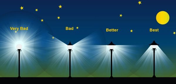Przykłady oświetlenia - od bardzo złego do optymalnego. Źródło: https://solutions.borderstates.comNa świecie znane jako Light Pollution (LP)czyli zanieczyszczenie nocnego nieba sztucznym światłem. Wślizgnął się jak cichy zabójca w nasze miasta i wsie. Bo już nawet małe miejscowości i wioski mają z nim coraz poważniejszy problem. Z pozoru niedostrzegalne zagrożenie w postaci, często nikomu nie potrzebnych, lumenów czai się i przynosi coraz więcej zagrożeń dla środowiska naturalnego czyli i dla nas też. Problemu zanieczyszczenia nocnego nieba sztucznym światłem nie dostrzegamy gdyż noc to nasz naturalny czas snu i odpoczynku. Zamykamy więc oczy bezpieczni w czterech ścianach i nie myślimy co dzieje się tuż obok nas, a dzieje się dużo. Żerują zwierzęta, owady i rosną rośliny. Szczególnie te ostatnie uzależnione od światła wpadają przez nasze żarówki w duży dysonans. W nocy żerują drapieżniki ale i jarosze. Noc jest dla nich naturalną ochroną by w miarę bezpiecznie zdobyć pokarm i przemieścić się na nowe tereny. Wbrew pozorom jesteśmy bardzo uzależnieni od dobrze funkcjonującego środowiska naturalnego. Wystarczy plaga myszy, szczurów czy latających szkodników byśmy sobie o tym przypomnieli. A przecież przyroda w równowadze biologicznej potrafi sama regulować optymalnie liczebność wszystkich osobników. Niewielkie wahania są wtedy bez większego znaczenia.