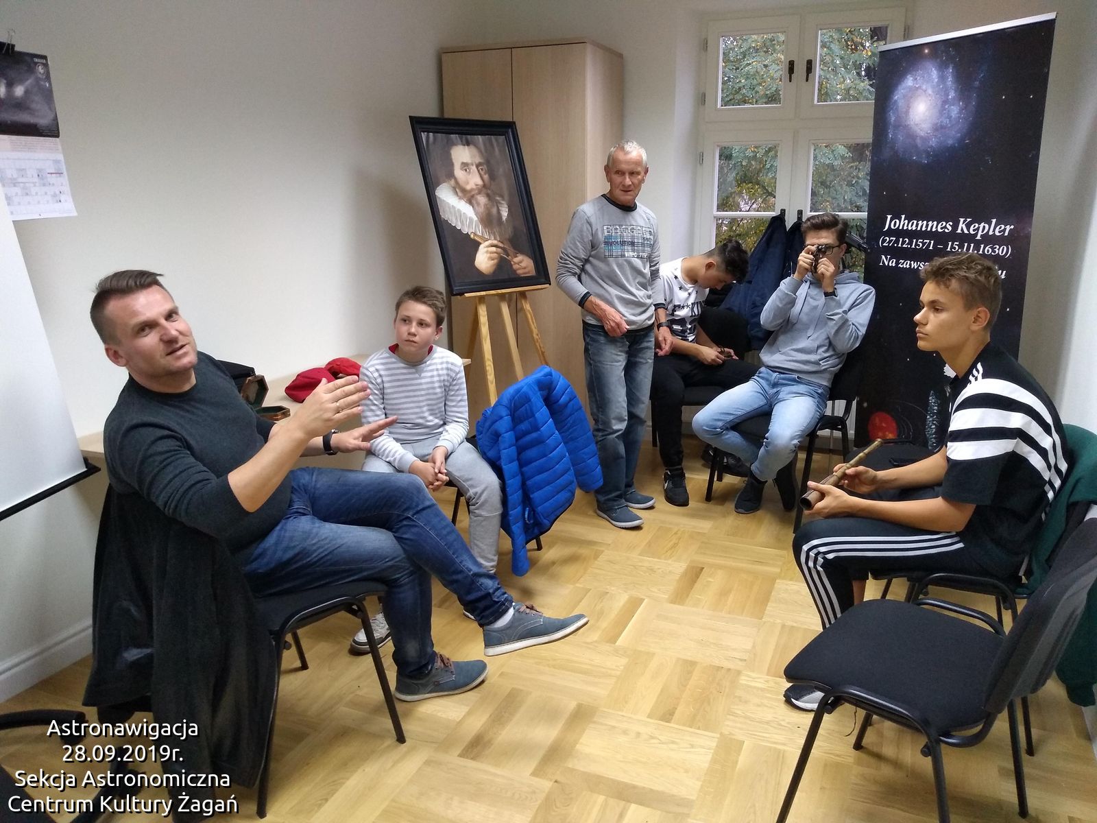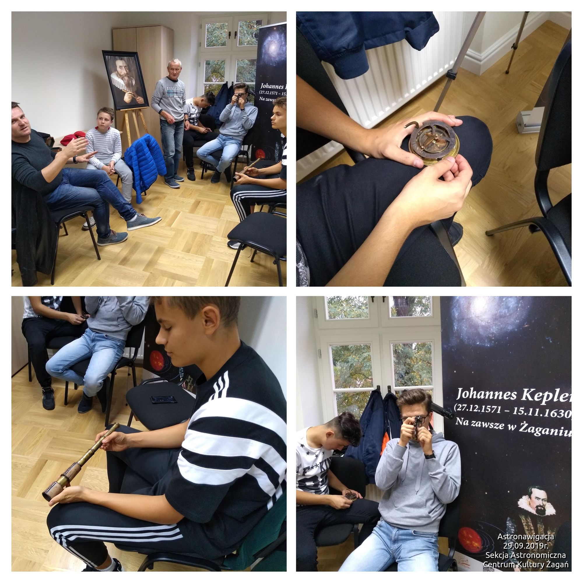 Dzisiejsza astronawigacji wygląda zupełnie inaczej niż ta znana nam z książek przygodowych czy historii wypraw Krzysztofa Kolumba i innych odkrywców nowych lądów. Ale i jedni i drudzy korzystali i korzystają z gwiazd by dotrzeć do celu i znaleźć drogę do domu. Na poprzednich zajęciach poznaliśmy zagadnienia związane z układami współrzędnych stosowanymi w astronomii. Tym razem kpt. Chimko przedstawił nam jak w podróżach morskich ustala się pozycję statku wykorzystując gwiazdy, Słońce czy Księżyc. Na spotkaniu poznaliśmy działanie sekstantu oraz własnoręcznie wyznaczaliśmy pozycję … no niestety lampy, bo niebo zachmurzyło się jak na złość.