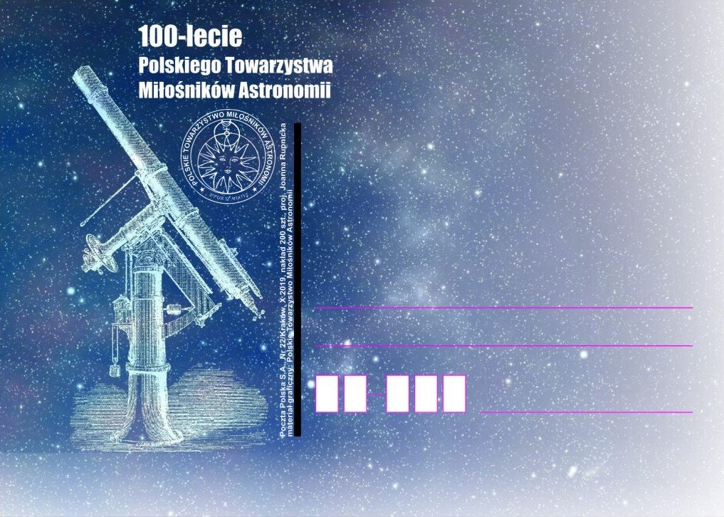poczta wydała okolicznościową kartkę, które wizerunek prezentujemy. Źródło: URania Postępy Astronomii„Święto Astronomii w Krakowie” – pod takim tytułem zorganizowano w sobotę w Krakowie obchody 100-lecia Polskiego Towarzystwa Miłośników Astronomii (PTMA), największej polskiej organizacji zrzeszającej entuzjastów astronomii i jednocześnie jednego z najstarszych polskich stowarzyszeń.