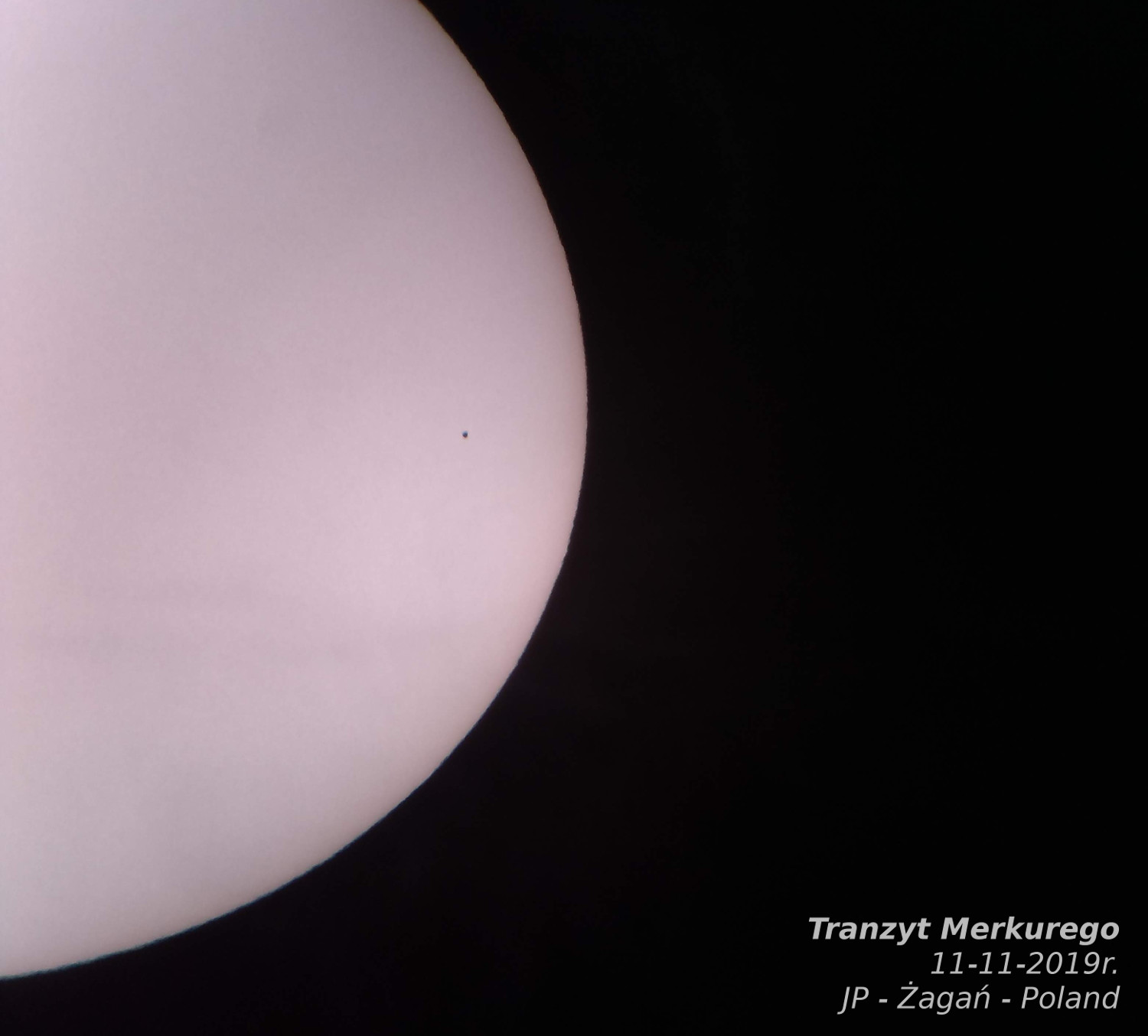 Tranzyt Merkurego w dniu 11 listopada 2019r. obserwowany w Żaganiu przez Sekcję Astronomiczną11 listopada to szczególny dzień. A 2019 roku był tym bardziej szczególny, bo Słońce przesłoniła najbliższa niego planeta – Merkury. Wszystkiemu winna jest koniunkcja. Na niebie Słońce i planeta zajęły dokładnie to samo miejsce. Niemożliwe? Wszak to obecnie najczęstszy sposób odkrywania planet pozasłonecznych. O co więc tu chodzi?