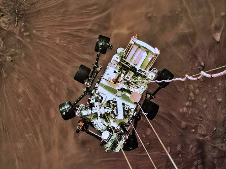 Łazik Perseverance zawieszony na linach dźwigu w czasie lądowania na Marsie. Źródło: NASADzięki misji łazika Perseverance po raz pierwszy w eksploracji Kosmosu wykorzystany zostanie helikopter. Zdaniem ekspertów może przyczynić się on do rewolucji w eksploracji Marsa, umożliwiając poznawanie znacznie większych obszarów Czerwonej Planety niż do tej pory. W czwartek wieczorem amerykański łazik Perseverance wylądował na Marsie. Naukowcy z NASA stawiają kilka celów naukowych dla misji Perseverance. Poszukiwać on będzie śladów organicznego życia, wykonywać będzie pomiary składu chemicznego i mineralnego powierzchni, a także temperatury, prędkości i kierunku wiatru, ciśnienia, wilgotności względnej i właściwości unoszącego się w atmosferze pyłu.