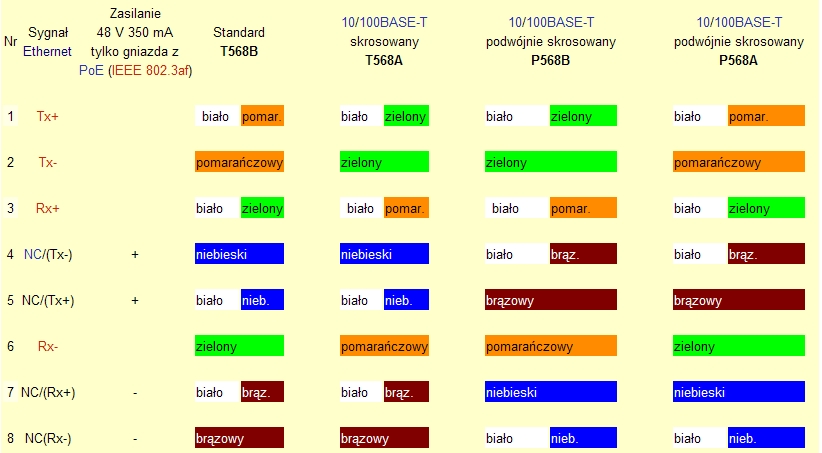 Poniżej prezentuję grafikę z układem kolorków kabelków wg standardów.