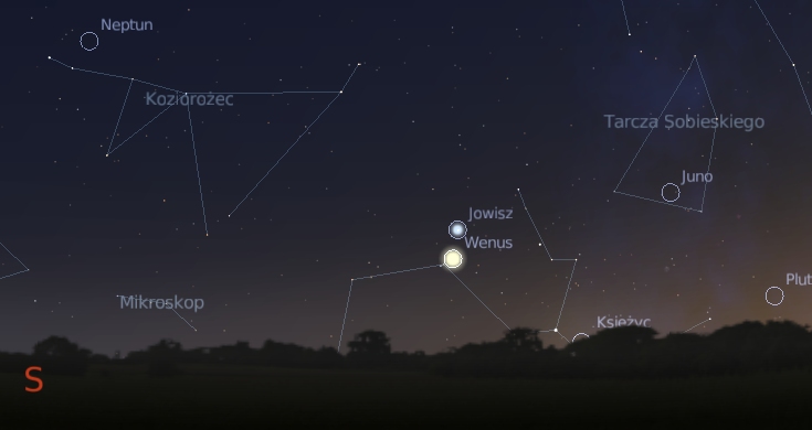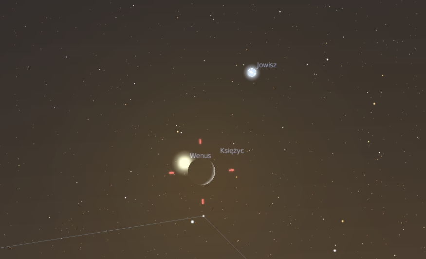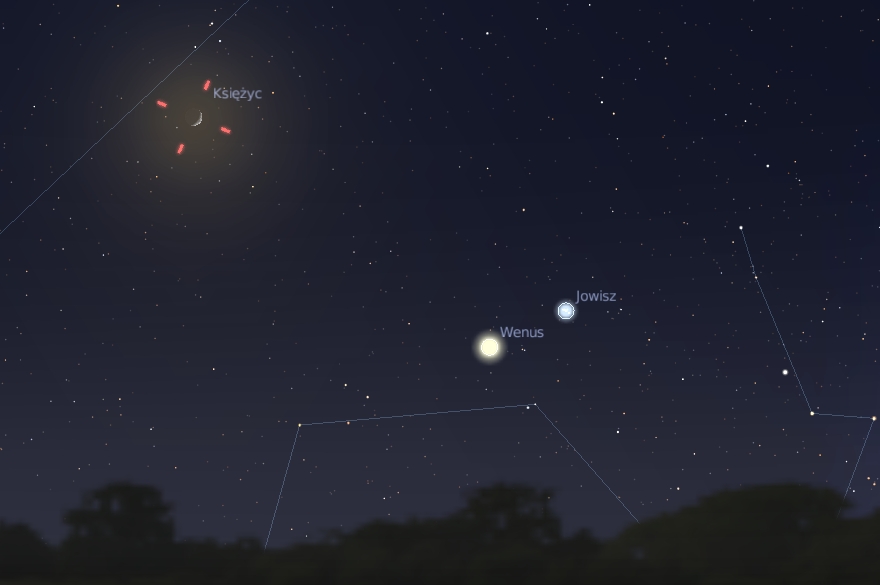 W dniu wczorajszym w kierunku południowo zachodnim można było zobaczyć wspaniałą koniunkcję Jowisza i Wenus. Co prawda w mieście panowała lekka mgła w związku ze zmniejszającą się wieczorem temperaturą, ale dzisiaj zjawisko będzie jeszcze piękniejsze. Do koniunkcji dołączy młody Księżyc. Co za romantyczny wieczór!!