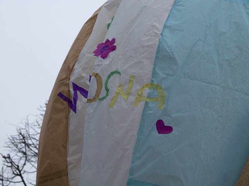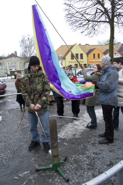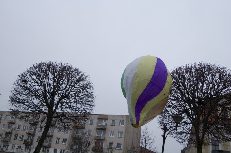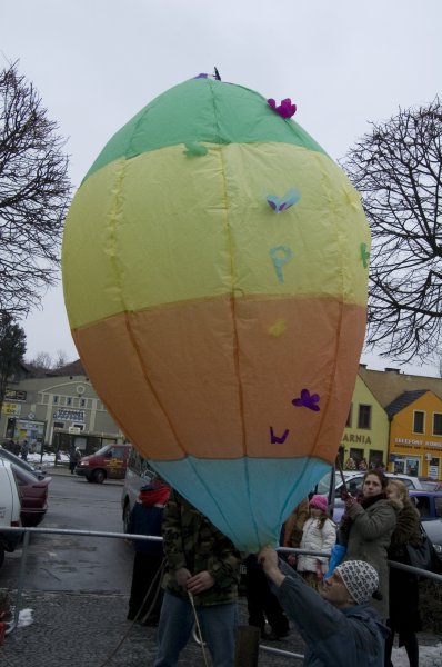 Wieść się rozeszła że bawimy się świetnie przy okazji poważnej imprezy i nie mogliśmy się pomieścić w Sali. Tyle nas było. Powstały kolejne balony. Wszystkim już marzy się wiosna, wiec ten temat na nich też zagościł. A ponieważ jutro pogoda może nam sprawić psikusa w postaci deszczu, zapadła decyzja, balony lecą dzisiaj. Wszyscy wyszli na główny plac miasta – Plac Słowiański. I nasze wspaniałe, kolorowe konstrukcje zostały napełnione fachowo przez Pana Tomasza, gorący powietrzem. W ten sposób wiedza teoretyczna zdobyta na zajęciach przeistoczyła się w praktyczne doświadczenie. Niektóre balony fikały koziołki. Był nawet taki który się spłonął w locie. Ale takie jest ryzyko tego zawodu. Jak pokazuje fotoreportaż (autorem zdjęć jest Bartłomiej Patka) balony poleciały do nieba, a wszyscy mieli buzie uśmiechnięte – jak zawsze zresztą.