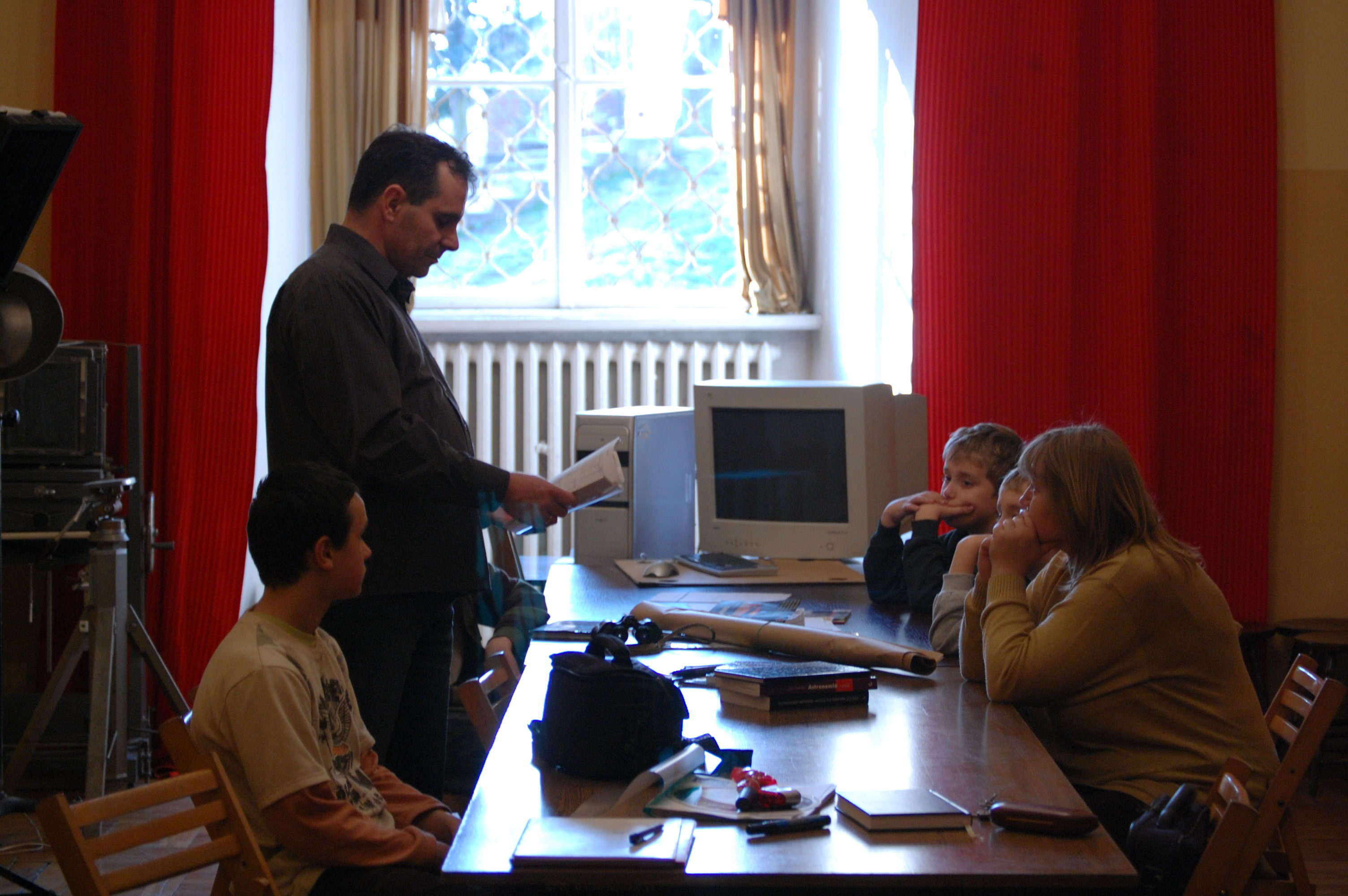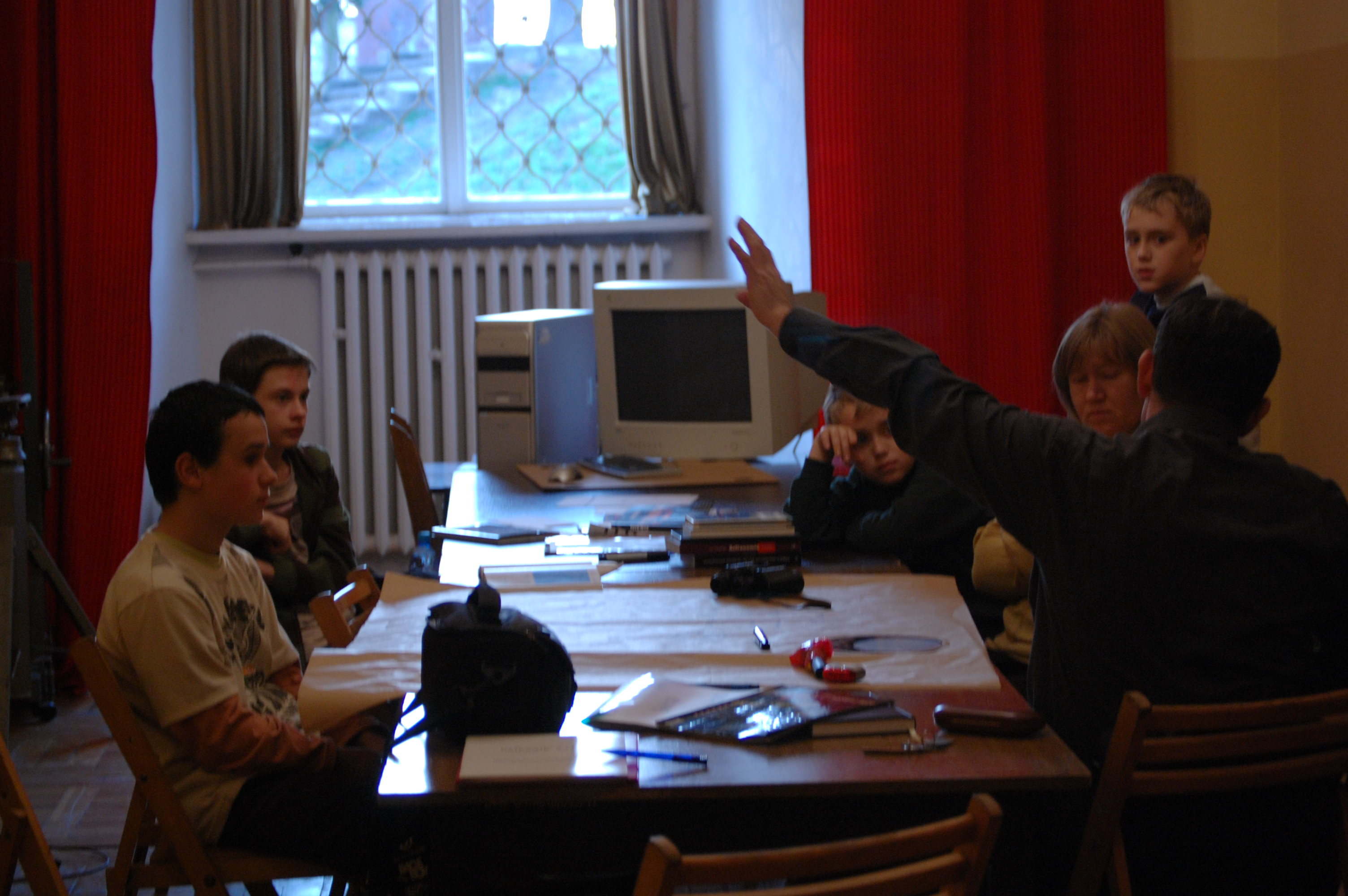 W dniu 4 marca od godziny 17.00 ponownie odbyło się spotkanie Sekcji Astronomicznej. Na wstępie przyjęliśmy w skład naszego zespołu nowego miłośnika – Krzyśka. Planowany porządek spotkania przewidywał podróż wirtualną po Układzie Słonecznym. Jak to jednak zawsze na naszych spotkaniach bywa nie tylko „chlebem i wodą” się żyje. Dyskusje wędrują różnymi ścieżkami i poznaliśmy przy tej okazji wiele zagadnień w tym: ogólną budowę teleskopu astronomicznego i związanymi z nim parametrami optycznymi – zdolność rozdzielcza, graniczne powiększenia, a nawet za sprawą Michała i Macieja (to nasz Kastor i Poluks z Bliźniąt – nikt nie wie który jest który, no chyba, że ich mama ona misi mieć jakiś sposób) zastanawialiśmy się czy i dlaczego możemy się spodziewać lub nie, że na innych planetach jest życie. Jak się okazało, po porównaniu danych z tablic astronomicznych ciśnienie atmosferyczne na Marsie jest tak małe, że nawet gdyby zamiast dwutlenku węgla było tam powietrze, to łatwiej jest oddychać na Mount Evereście niż na powierzchni tej czerwonej planety.