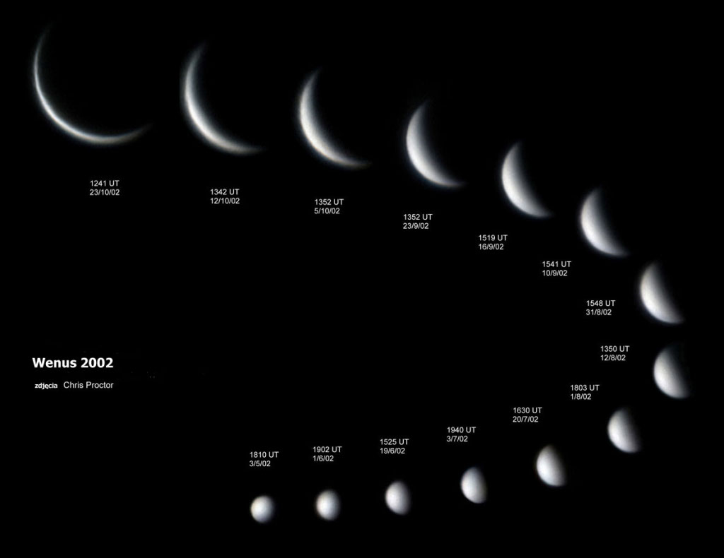 Pierwszą rzeczą jak nasuwa się w obserwacji dołączonych obrazów Wenus to występowanie faz podobnych do faz Księżyca. Co świadczy, że planeta zmienia swój kąt pozycyjny względem Ziemi i Słońca. Innymi słowy, Wenus porusza się względem Ziemi w taki sposób jak Księżyc i dlatego obserwujemy, że nie zawsze cała powierzchnia planety jest zwrócona oświetloną częścią do Ziemi. Planeta jest zawsze obserwowana w pobliży Słońca. Nigdy nie osiąga miejsca opozycji, czyli takiego położenia, że Ziemia znajduję się między Słońcem a planetą Wenus.
