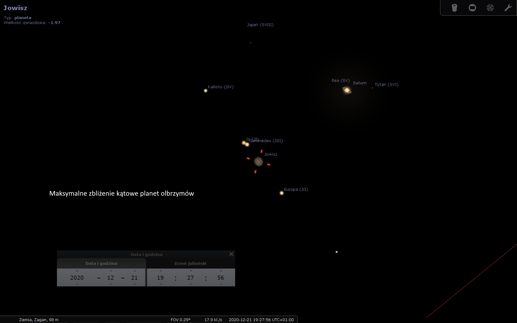 Gazowe olbrzymy należą do najciekawszych planet do obserwacji na niebie. Saturn ma piękne pierścienie a Jowisz galerie księżyców i pasy oraz słynną Wielką Czerwoną Plamę. Do tej pory widzieliśmy je zawsze oddzielnie. W tym roku ich opozycje zeszły się w czasie. Już to wróżyło piękny układ tych planet względem Ziemi. Ale na grudzień 2020 szykowała się nie lada gradka. Wszystko za sprawą ustawienia tych planet i Ziemi. 21 grudnia o 19:27 UTC+1 planety zbliżyły się na nieco ponad 6’ (minut) kątowych do siebie. To spowodowało, że już od kilku dni dało się je zaobserwować w jednym polu widzenia większości amatorskich teleskopów, a w czasie kulminacji tej koniunkcji nawet te większe mogły pokazać dwie planety za jednym razem nawet przy sporym powiększeniu. Typowy amatorski teleskop podstawowe powiększenie ma w okolicach kilkudziesięciu razy (od 40 - 60 razy). Ale może ono dojść nawet do kilkuset razy przy większych aperturach (średnicach) i większych ogniskowych. Specjalistyczne okulary dają spore pole do popisu. A jasność obu bohaterów tegorocznego grudnia dała szanse na zobaczenie rzeczy, które widać raz na około 400 lat.