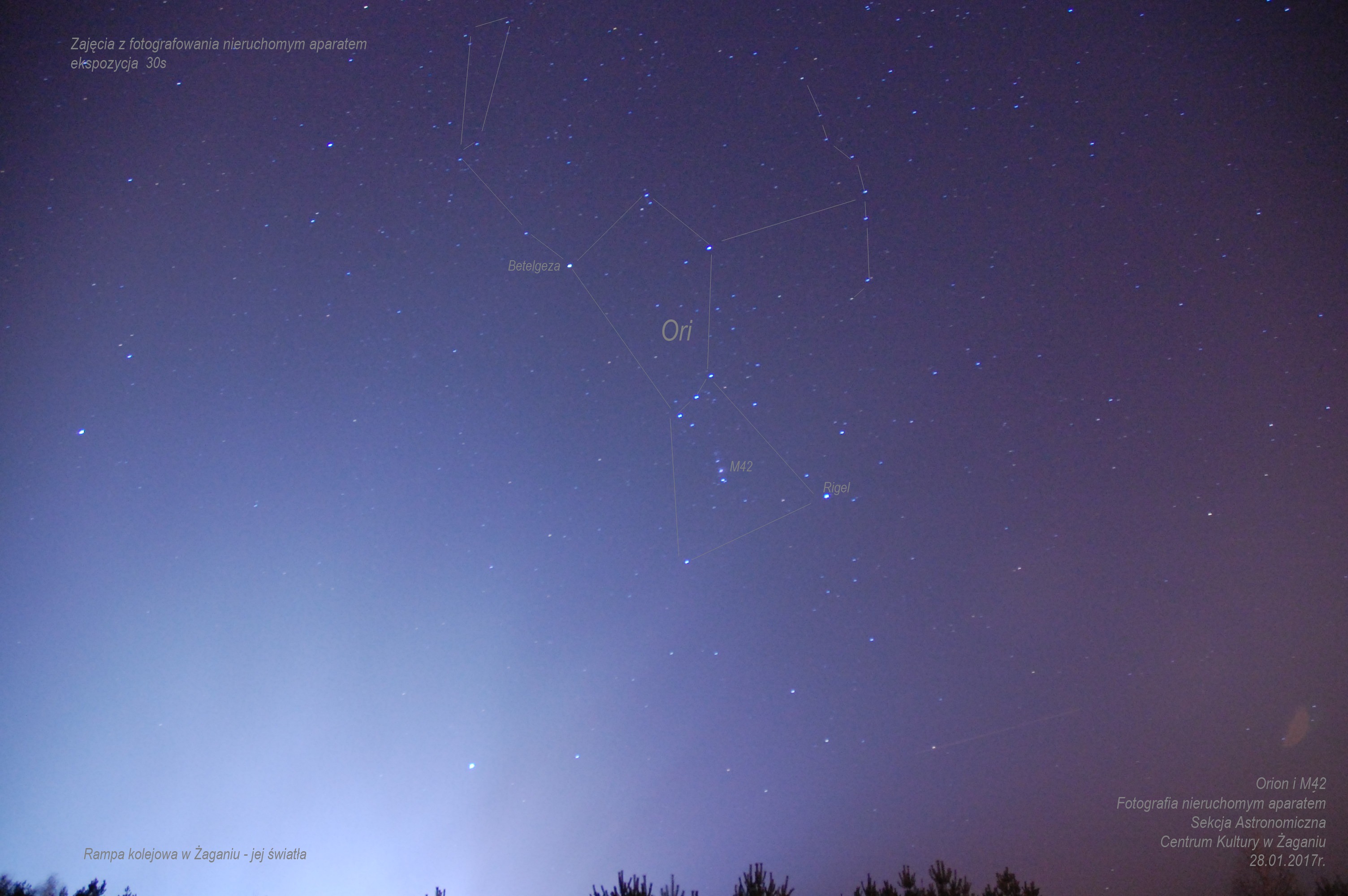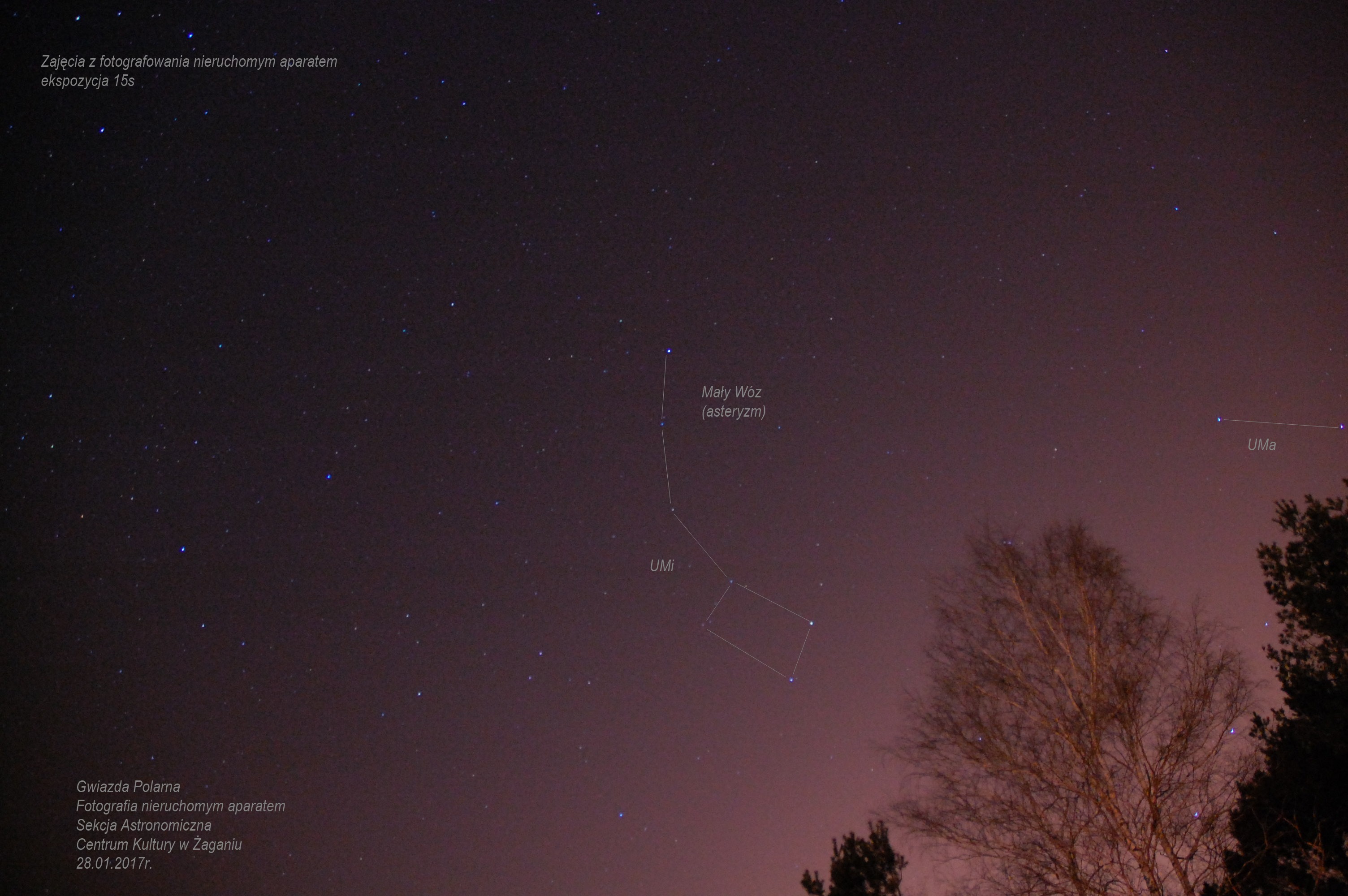 Celem zajęć i ćwiczeń było poznanie możliwości fotografowania nieba nocą za pomocą nieruchomego aparatu fotograficznego na statywie fotograficznym. Zależnie od kierunku patrzenia względem osi rotacji Ziemi mamy różne możliwości rejestracji obiektów kosmicznych. Im większa odległość od osi rotacji, tym krótszy czas ekspozycji mamy dla zarejestrowania gwiazd w postaci akceptowalnych kropek - punktów.