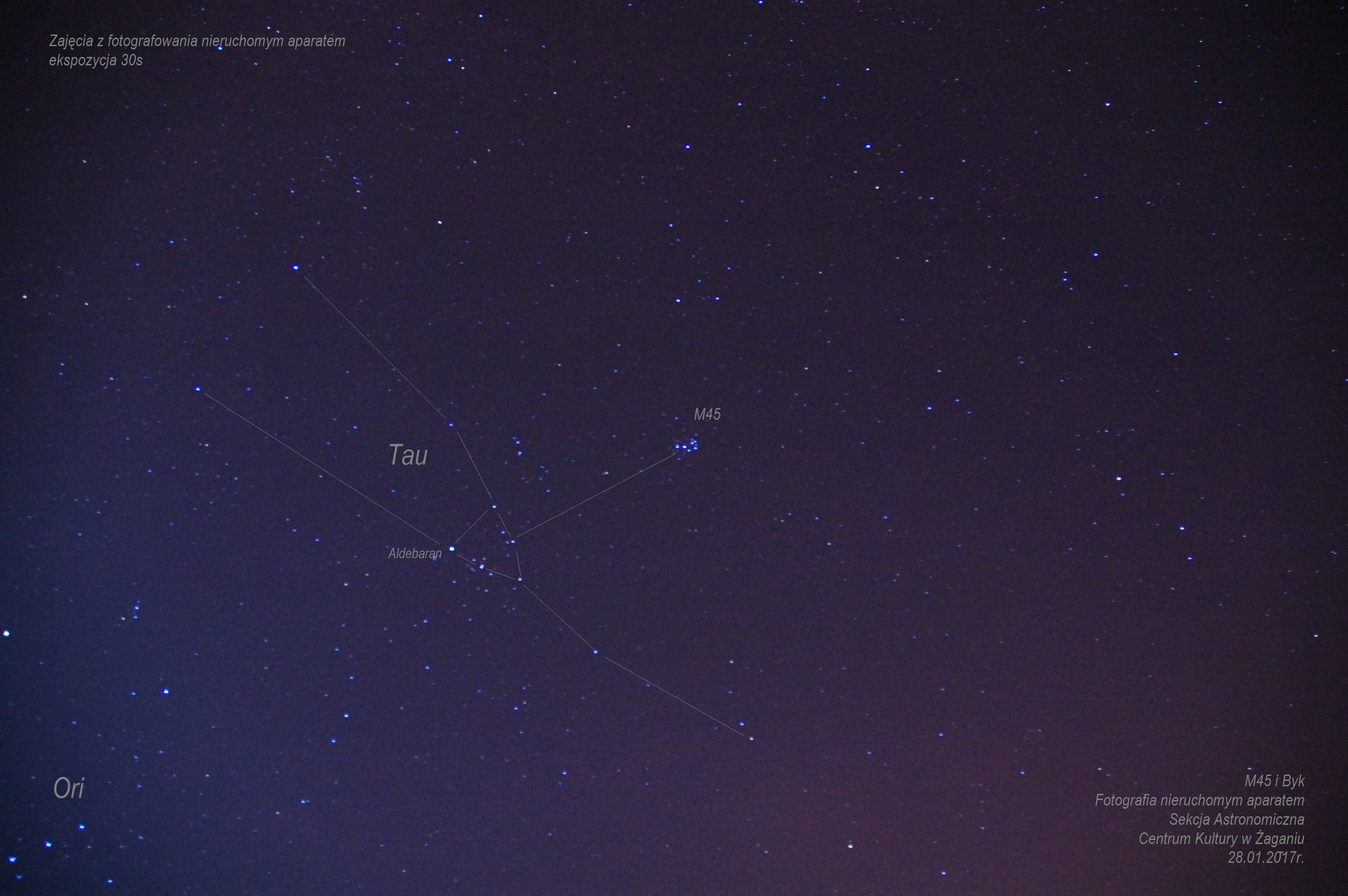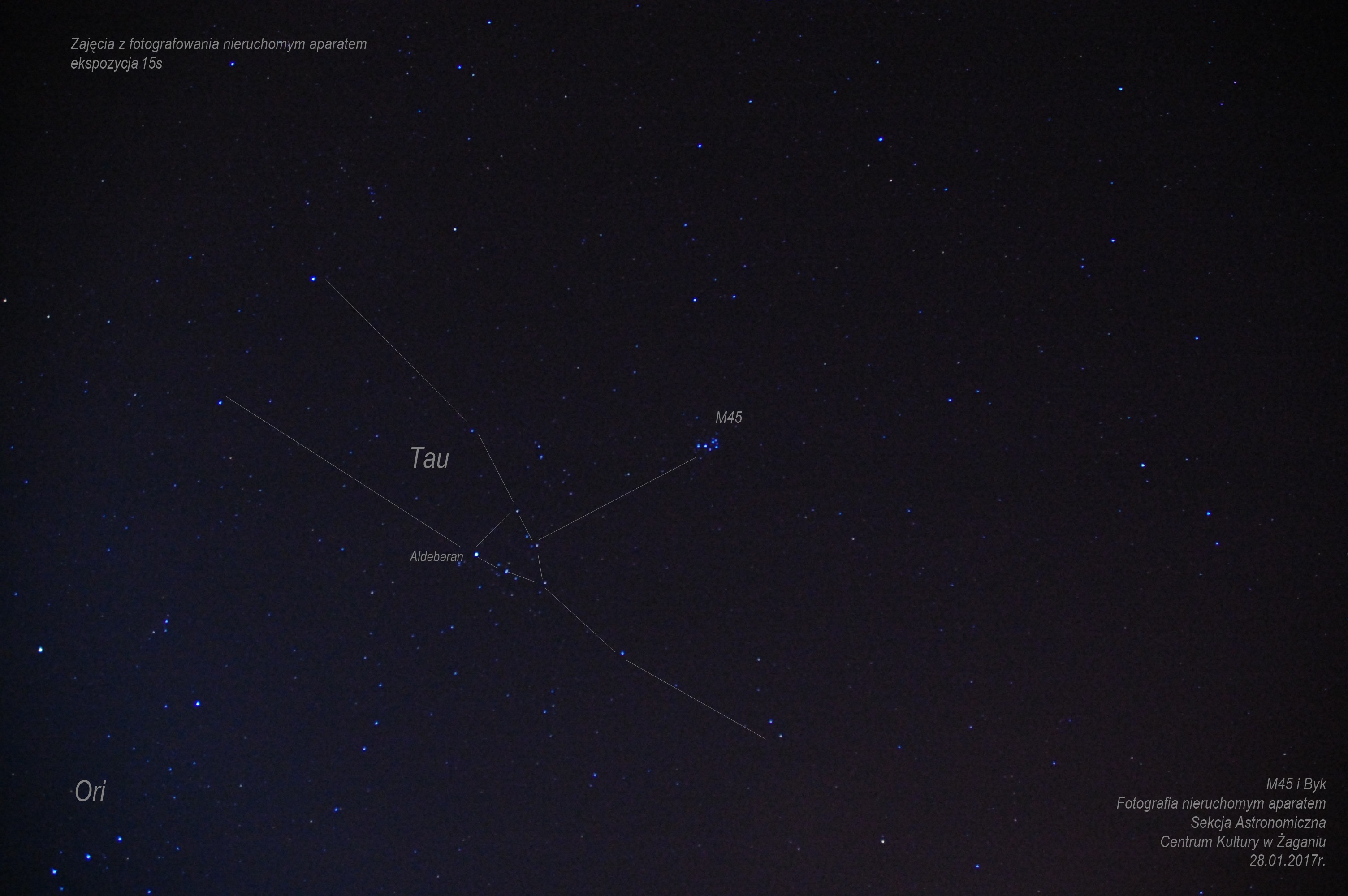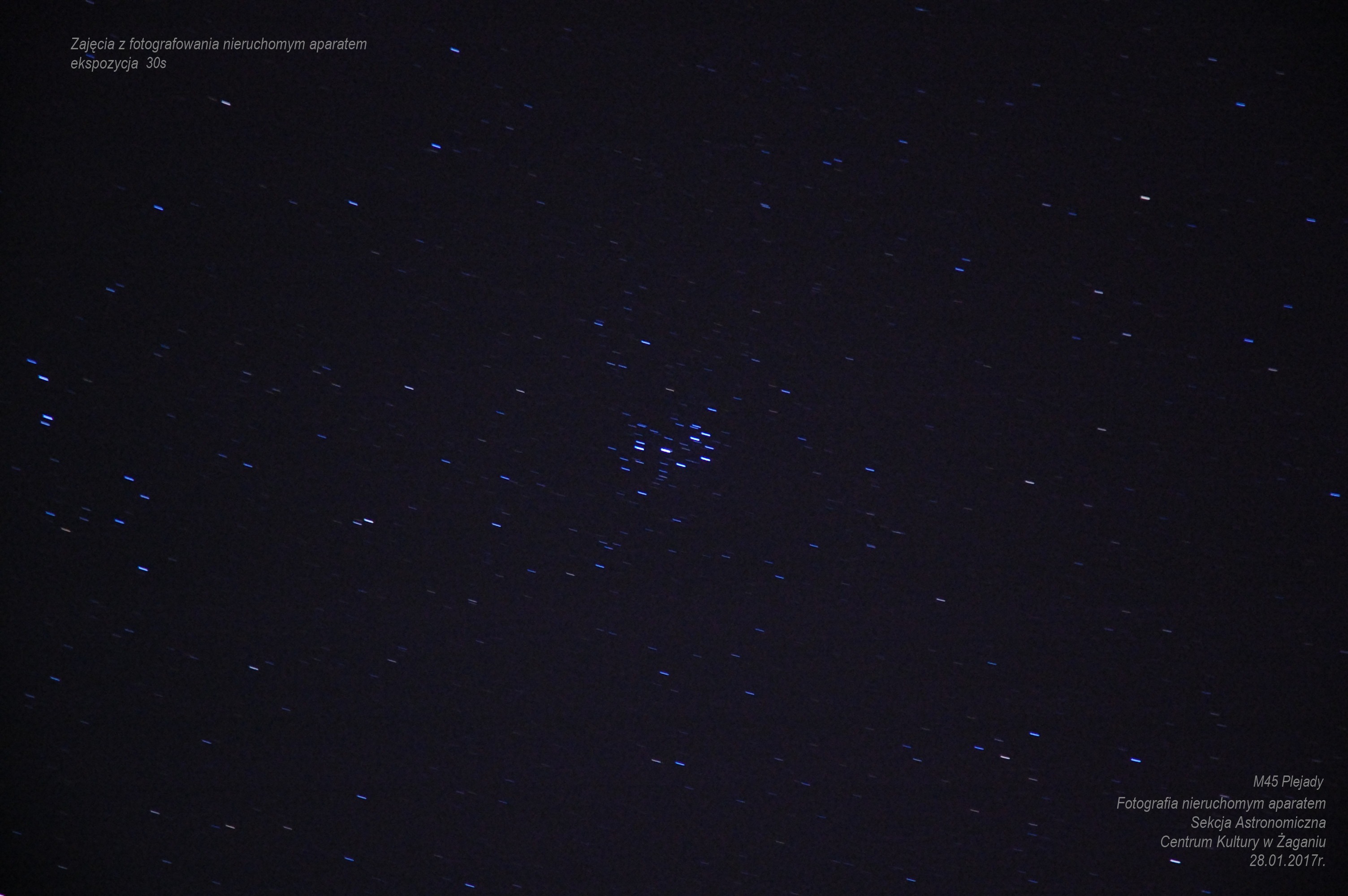 Bliżej równika niebieskiego musimy stosować zdecydowanie krótsze czasy, gdyż już 15s przy maksymalnej czułości naszego aparatu daje nam zarejestrowane przemieszczenie gwiazd na kadrze. Stosowanie długiej ogniskowej obiektywu, wymaga stosowania krótszych czasów ekspozycji. Przykład M45 tego wieczora będących w zenicie (ogniskowa 70mm) |