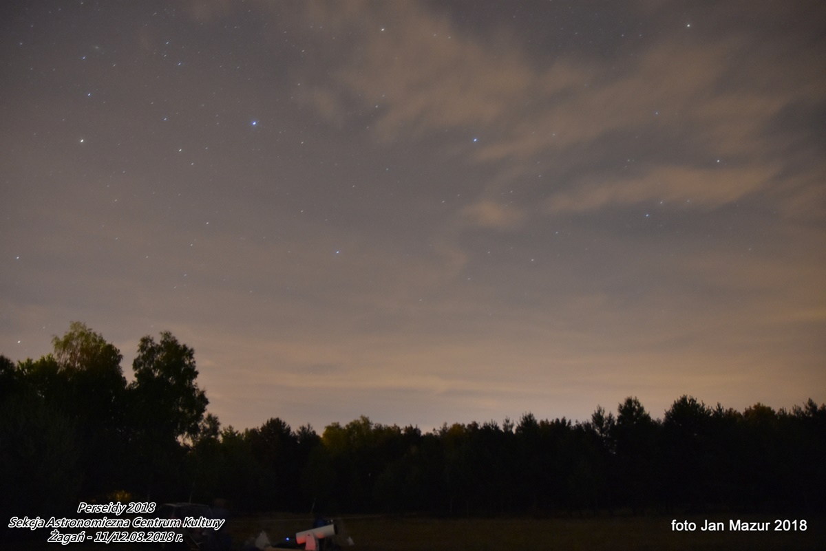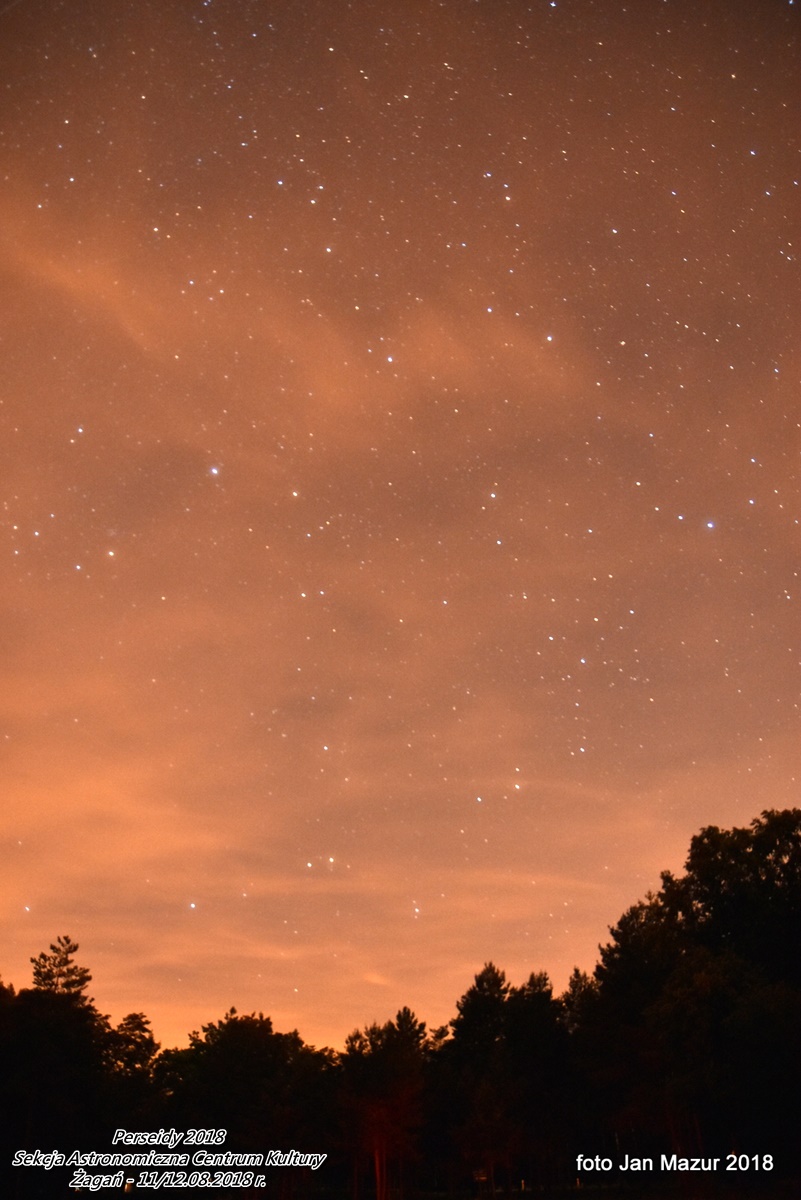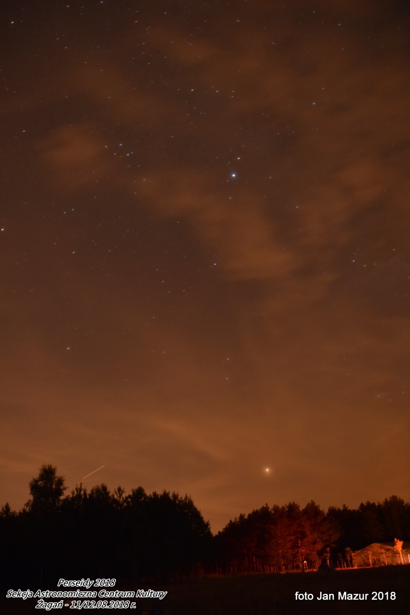 Obserwacje trwały od 21:30 dnia 11.08 do 3:30 dnia 12.08. 2018 r. Zarejestrowanych zostało w czasie obserwacji 248 meteorów. Warunki były piękne. Szczególnie po północy, gdy niebo wyczyściło się z chmur całkowicie. Po 1:00 ilość meteorów zdecydowanie wzrosła ... to był piękny spektakl w czasie nowiu Księżyca. |