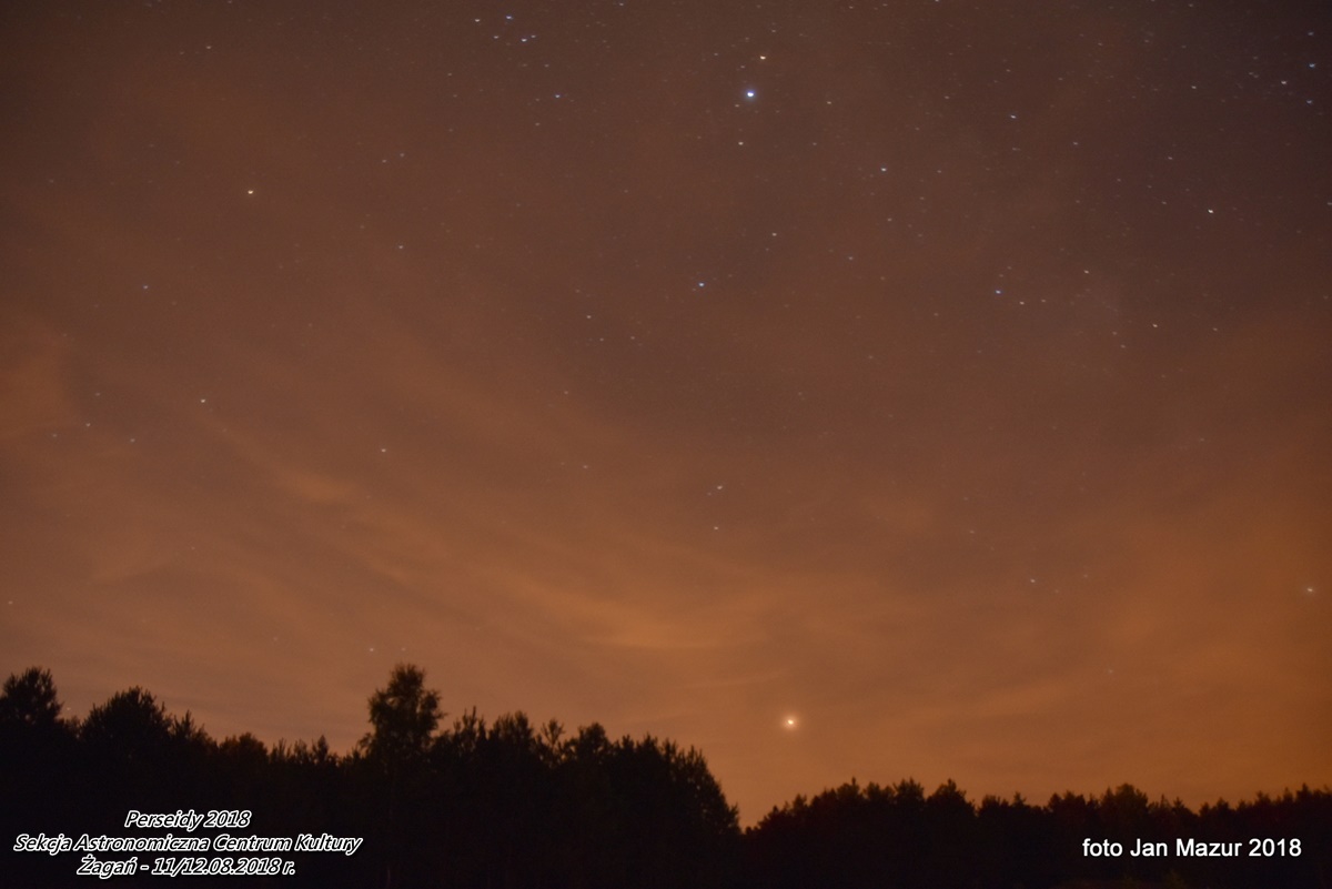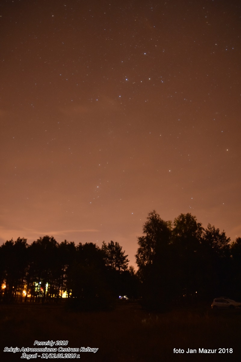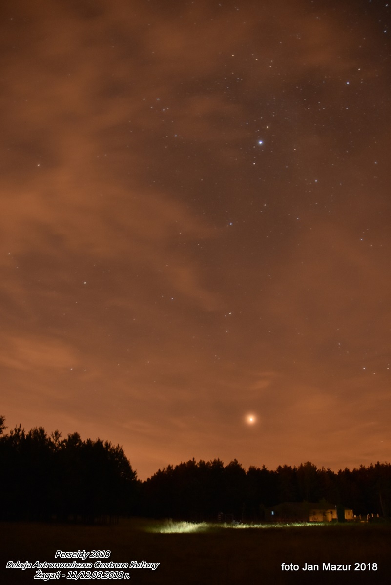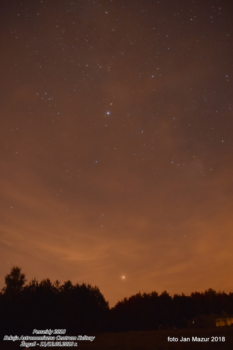 Obserwacje trwały od 21:30 dnia 11.08 do 3:30 dnia 12.08. 2018 r. Zarejestrowanych zostało w czasie obserwacji 248 meteorów. Warunki były piękne. Szczególnie po północy, gdy niebo wyczyściło się z chmur całkowicie. Po 1:00 ilość meteorów zdecydowanie wzrosła ... to był piękny spektakl w czasie nowiu Księżyca. |