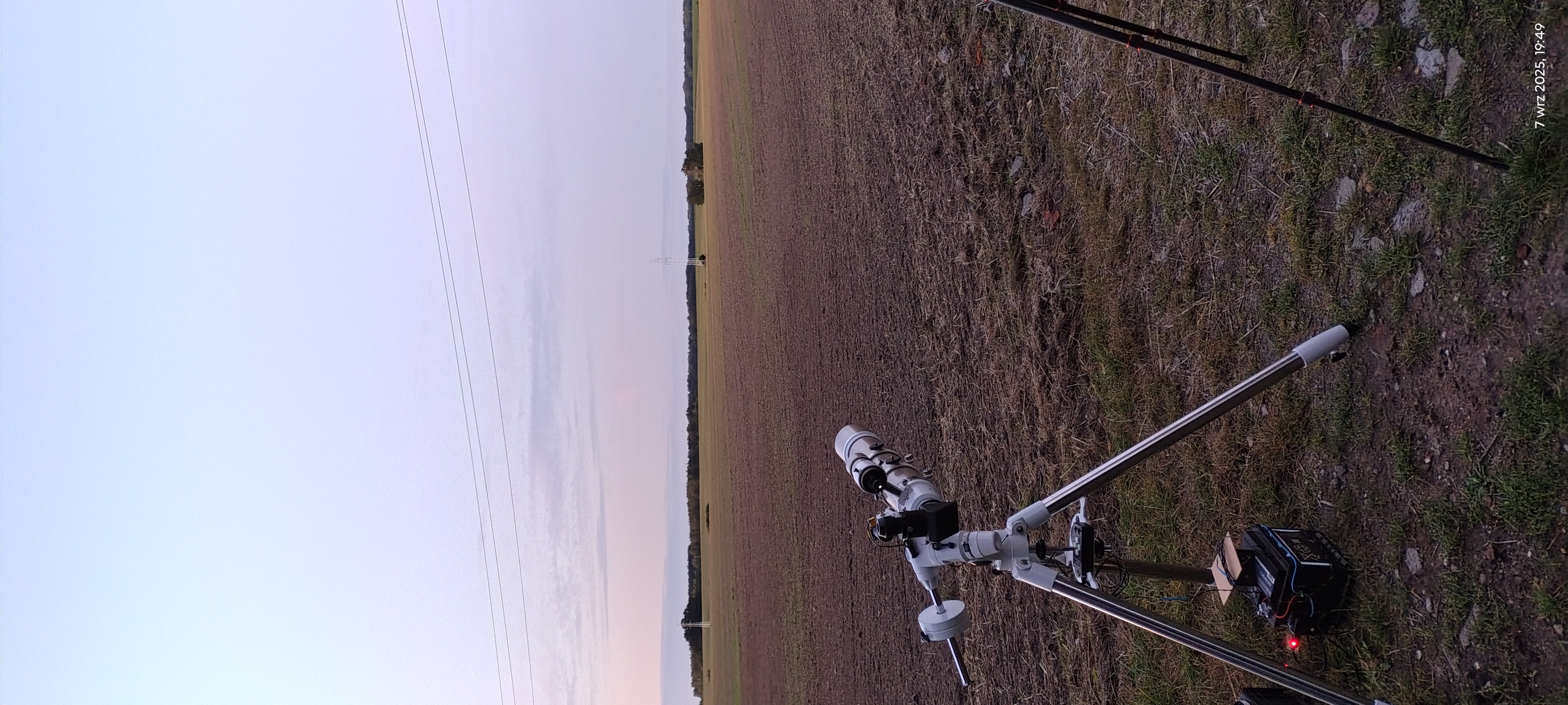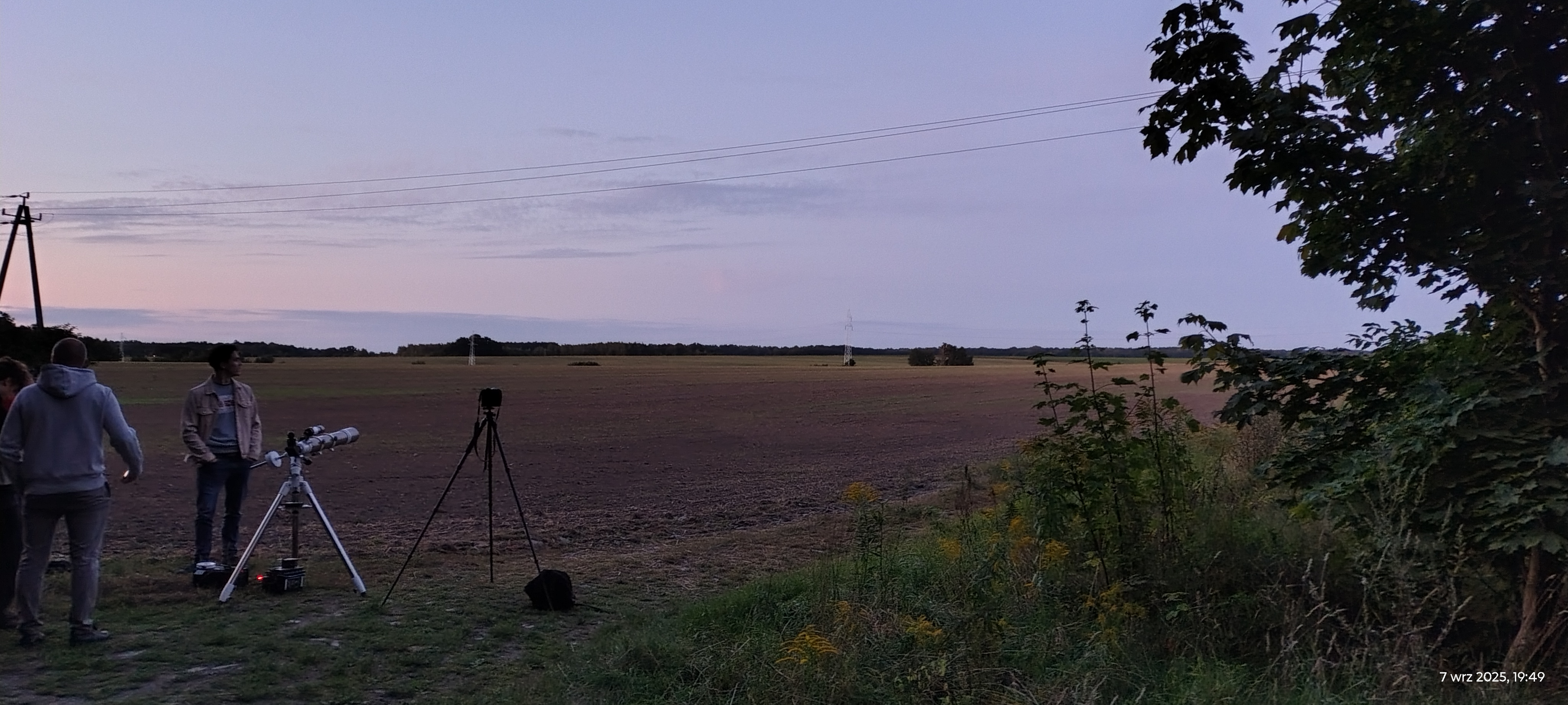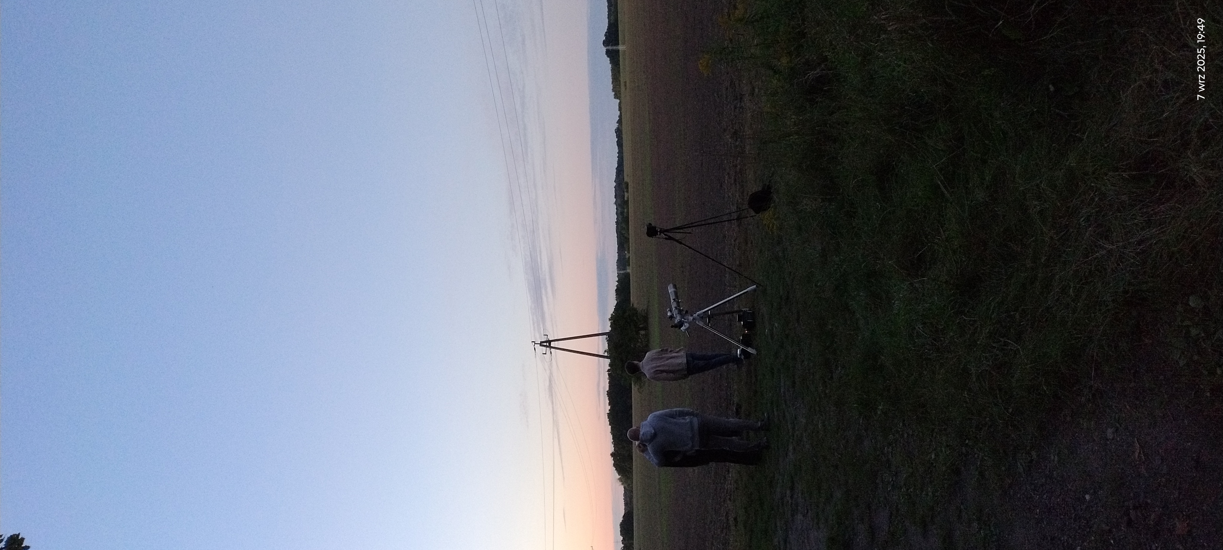 Warunki obserwacyjne dobre, choć nad horyzontem zachmurzenie. Wcześniejsza zła pogoda nie pozwoliła przetestować przygotowań i wschód Księżyca nieco zaskoczył nas kierunkiem obserwacji. Szybko przenieśliśmy się kilka kroków dalej i już spokojnie mogliśmy prowadzić obserwację. |
