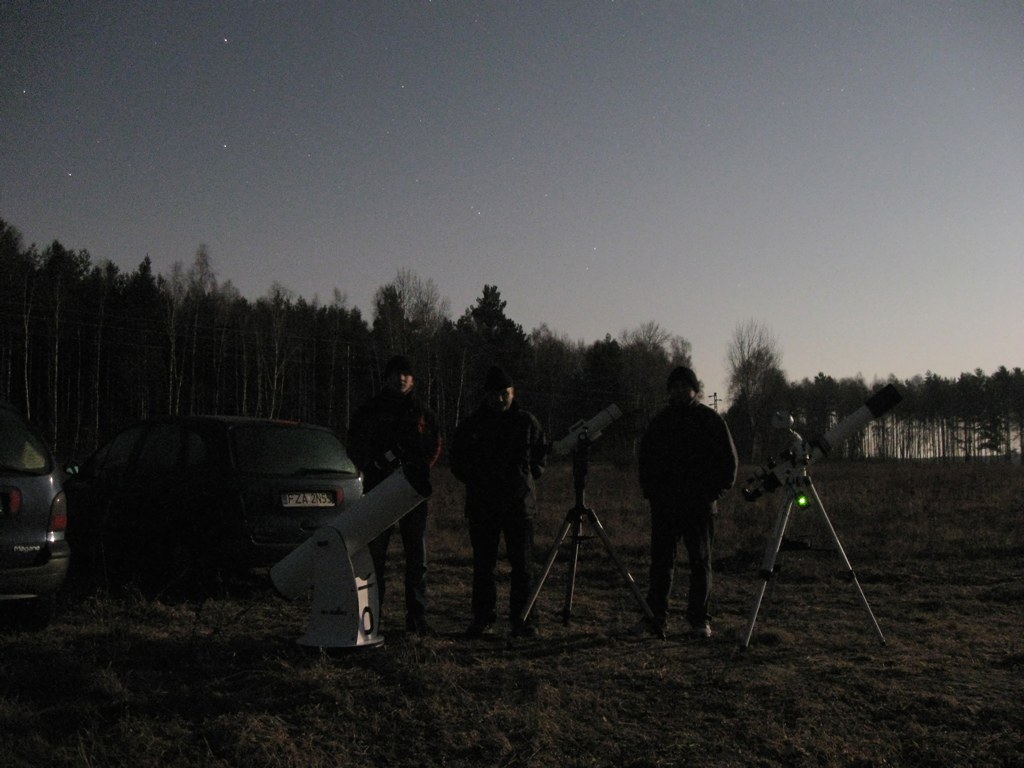 Zacmienie ksieżyca 10-12-2011 to juz drugie zacmienie Ksieżyca jakie moglismy obserwowac w tym roku. W czerwcu pogoda nam nie dopisała ale tym razem nie było tak źle. Naszej 3 osobowej ekipie udało sie zaobserwować cześc zjawiska: Od godz 15:20 stalismy na wybranym miejscu w Jankowej Żaganskiej z widokiem na azymut 53 st w którym to miał wzejsc zaćmiony Ksiezyc. Churwy,chmurwy,chmurwy i co chwila padajacy deszcz... ale napalency się nie poddają i ok godz 16;15 nadciagajaca od południowego zachodu niebieska dziura w chmurach spowodowała że postanowilismy zaczac rozstawiac sprzet lorneta Vixen, teleskop Tał 100RS i telskop Synta 8" na dobsonie, aparaty Canon 20D, Canon A580 i Olympus. Tak uzbrojeni Wypatrujemy Ksieżyca. O godz 16:20 pierwszy promyk nadziei, ukazuje nam sie czerwony sierp Ksieżyca:). Od tej chwili jest juz tylko lepiej, niebo robi sie bezchmurne i do godz 17:18 mozemy bez przeszkód obserwowac proces odkrywania tarczy Ksieżyca:) Oto kilka fotek z tej okazji. |