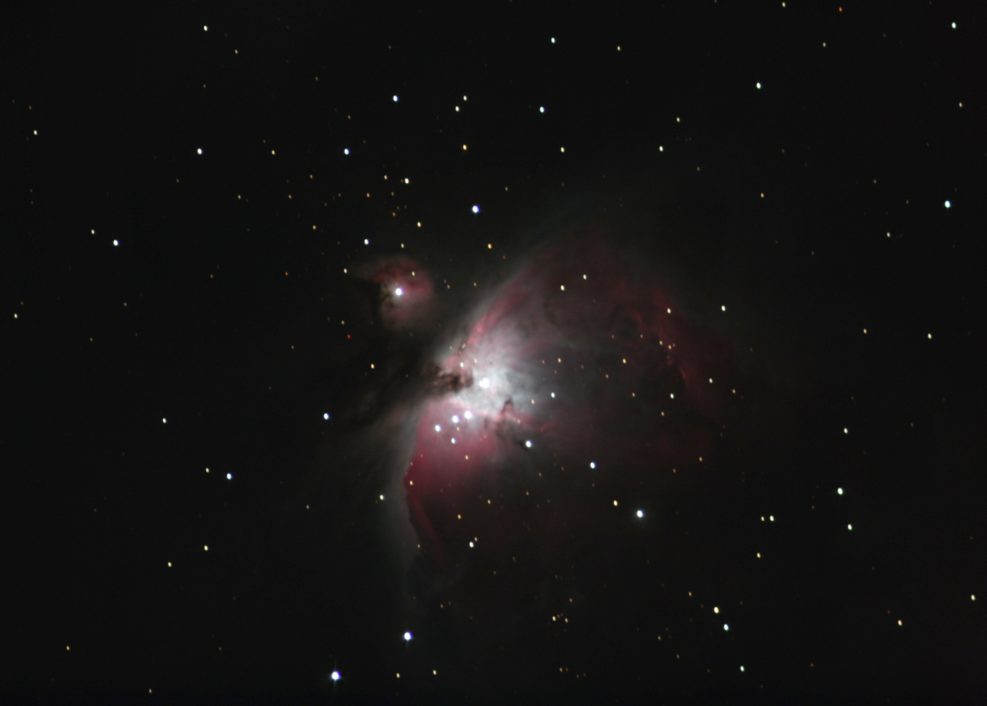 Dziś - 30 stycznia - dotarł do mnie zamówiony pierścień, adapter (M42/Eos) służący do zamocowania lustrzanki Canona do mojego Tała 100RS. Oto pierwsza fota wykonana z jego pomocą. Lustrzanka podpięta do wyciągu okularowego. Składanka zrobiona w DSS-sie 76 klatek po 25sek każda iso 1600 plus 10 klatek Dark frames. Gwiazdki są lekko pojechane ale montaż był ustawiony na oko bo chciałem tylko sprawdzić czy adapter pasuje:) Jak już się okazało ze pasuje nie mogłem odejść od teleskopu i przy 9 stopniowym mroziku zrobiłem około setki zdjeć z czego 76 nadawało się do stackowania w Dss-sie. Test wypadł obiecująco, wiec wkrótce na tapetę pójdą zapewne inne obiekty:)