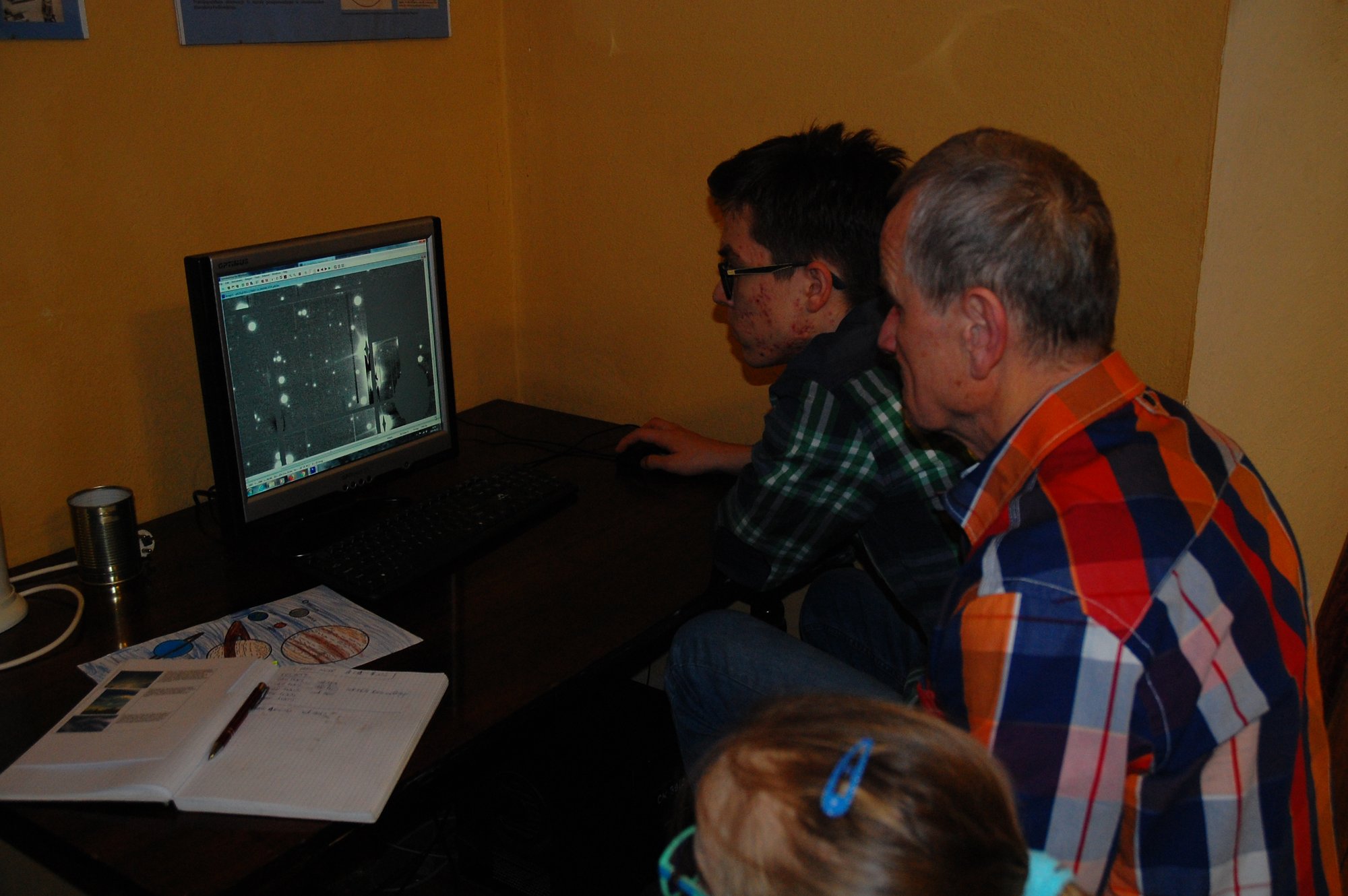 Sekcja Astronomiczna - analiza danych na zdjęciach PanStarrs w celu poszukiwania planetoid. Stefan, Mateusz używają programu Astrometrica do redukcji zdjęć. Potem szukają poruszających się obiektów.