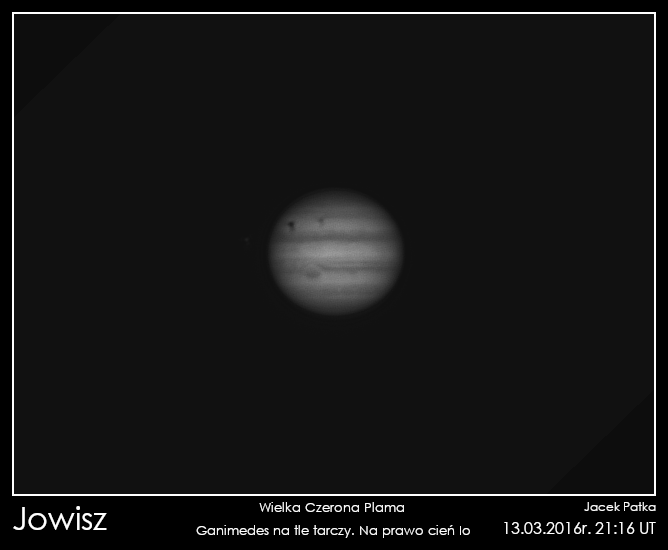 Wielka Czerwona Plama oraz Ganimedes na tle tarczy Jowisza. Jest też cień Io